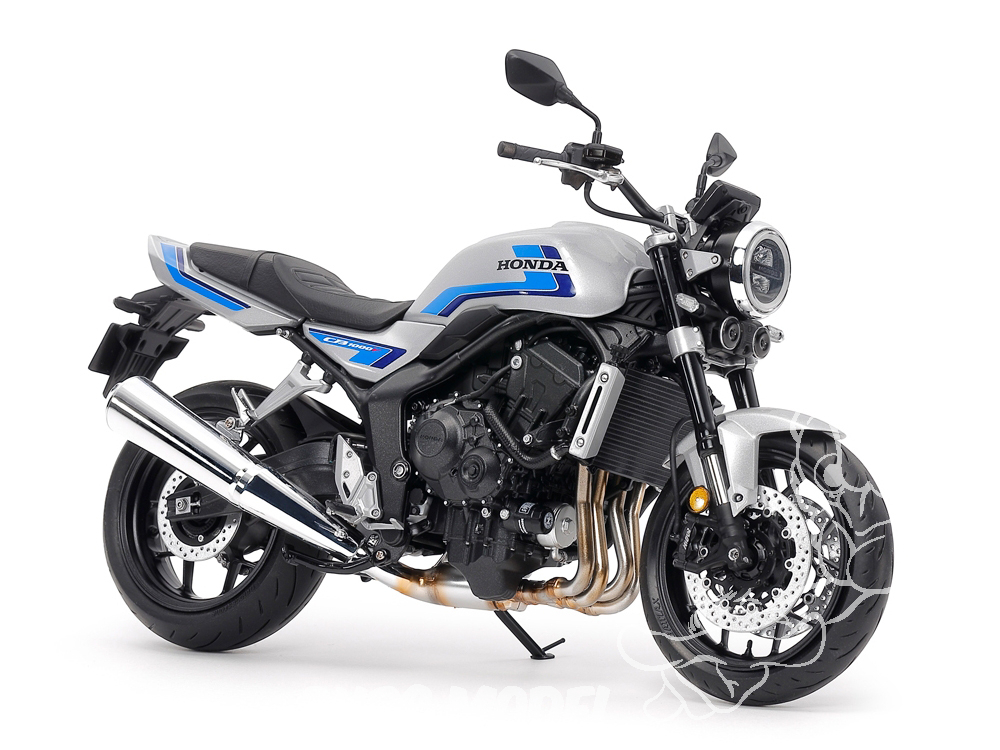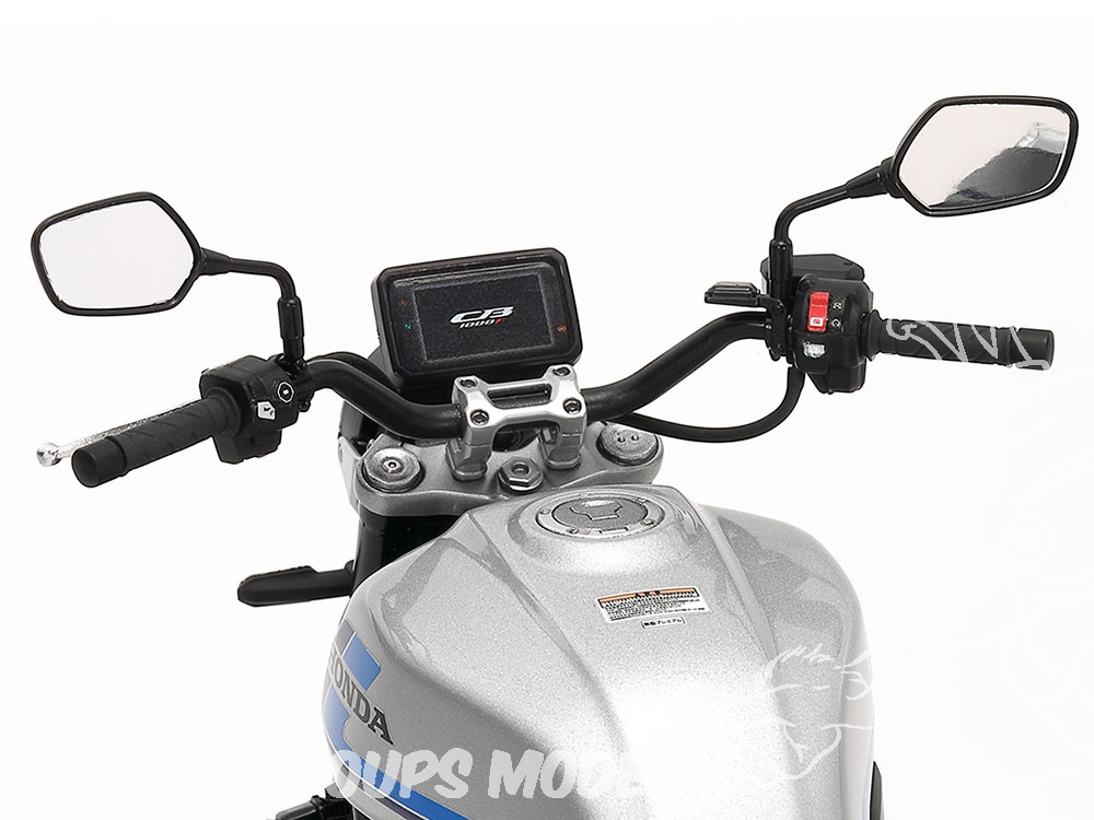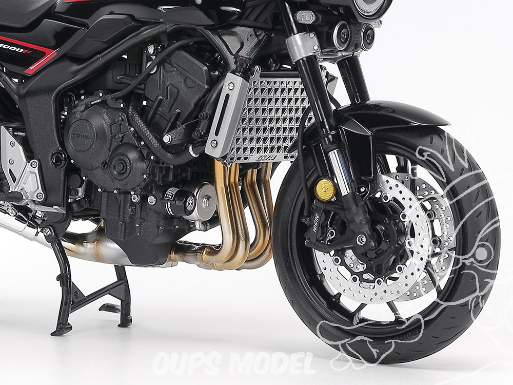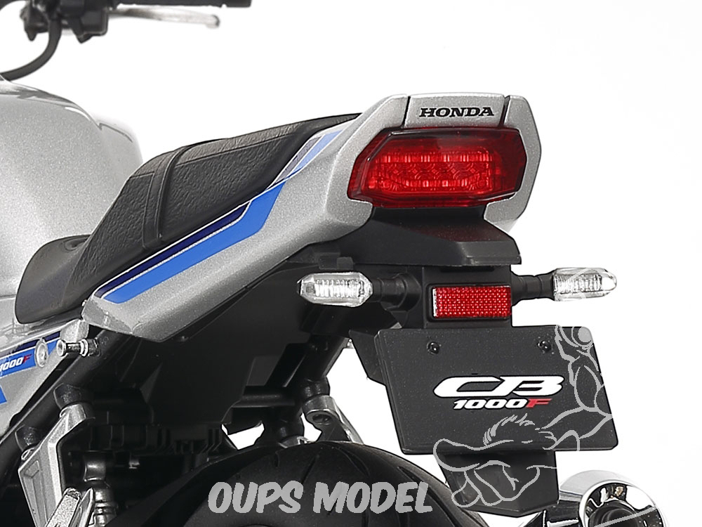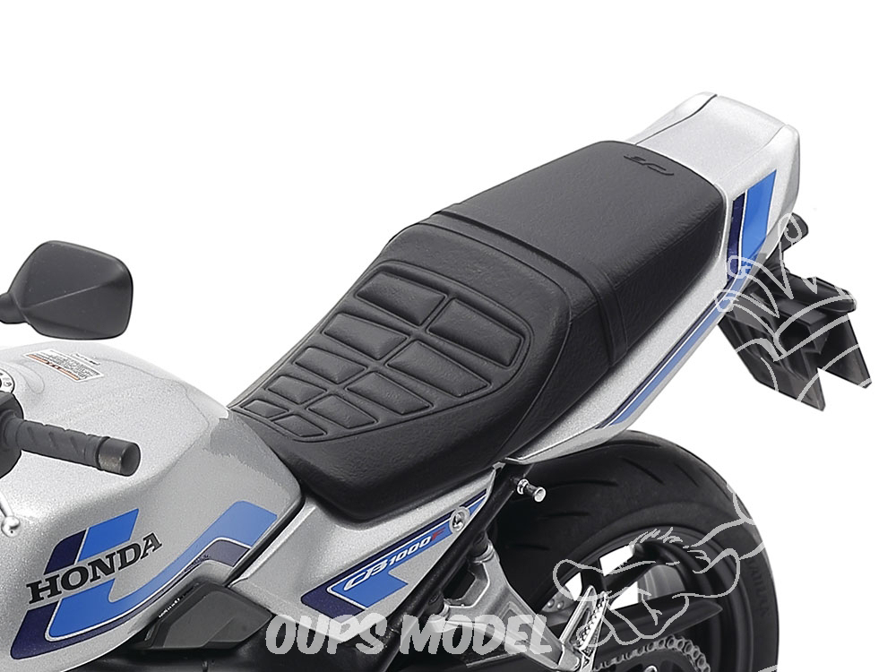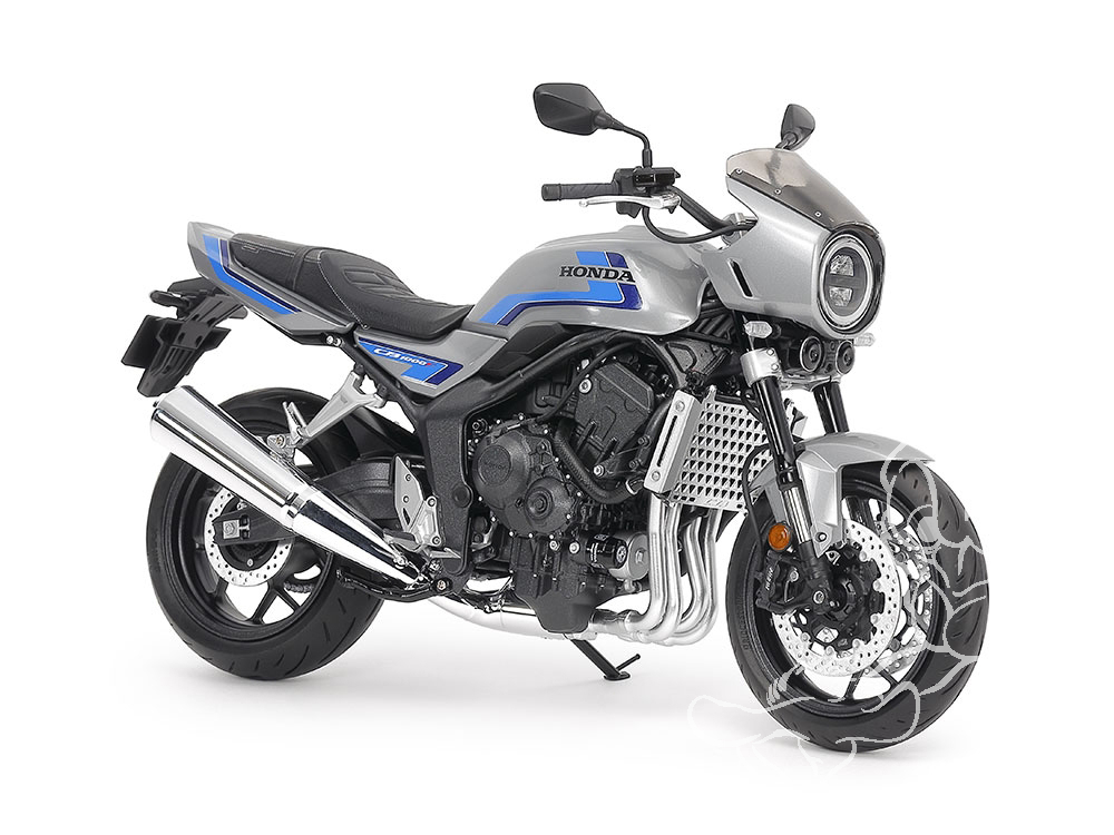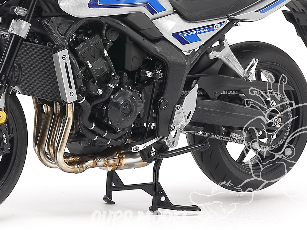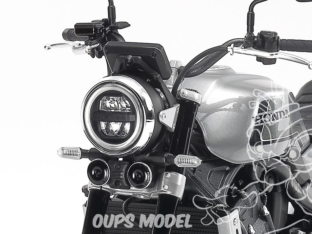 Le concept CB1000F “Best Balance Roadster” devait répondre à divers contextes, de l’utilisation quotidienne aux longs voyages. Il reprend et actualise le style emblématique "Flowing Line" popularisé sur les CB750F/900F qui l’ont précédé, avec une forme s’étirant harmonieusement du réservoir jusqu’à l’arrière, via des carénages latéraux arrière donnant à la moto sa silhouette musclée et élancée. Le phare rond attire le regard avec un design à la fois moderne et traditionnel, entouré d’un feu de position à LED avec cerclage chromé et partie centrale gravée du logo HONDA. A l’arrière, la surface de la selle s’inspire de la CB750F, et le regard est attiré par des éléments de design tels que le feu arrière angulaire et le silencieux dominant le côté droit de la moto. Pour certains, l’abréviation CB signifie "C" pour "motorcycle" et "B" pour "clubman", mais pour cette nouvelle version, "C" pour "creative" et "B" pour "benchmark" (référence) s’applique aussi bien. Tamiya nous propose dès maintenant une réplique fidèle et détaillée de cette remarquable et iconique machine.