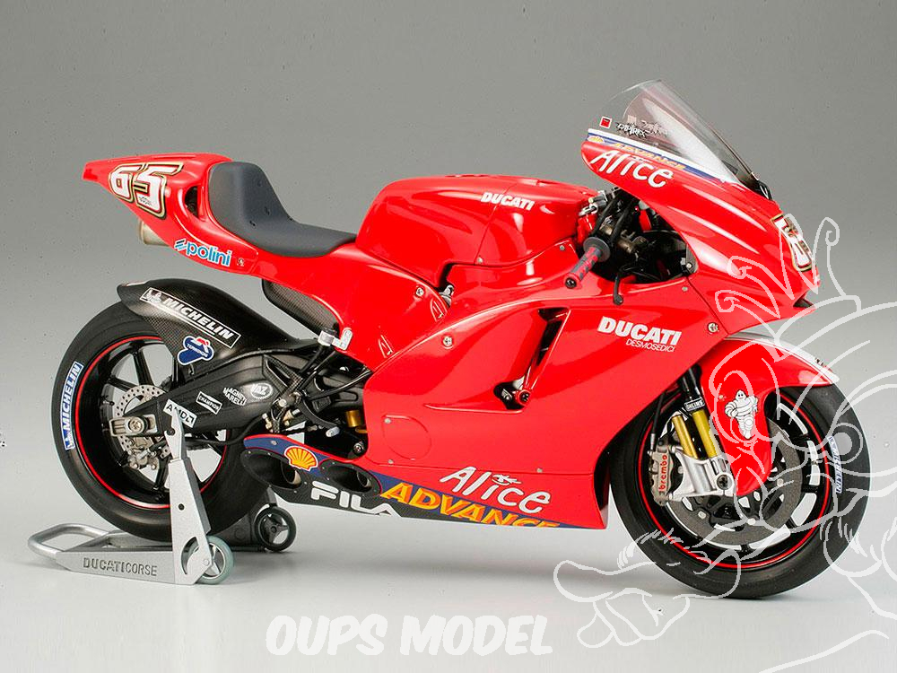 La prestigieuse Ducati italienne a fait ses débuts dans la catégorie MotoGP de la catégorie MotoGP du championnat du monde de course sur route à deux roues en 2003 et a soudainement obligé son rival à vaincre ses rivaux. En 2004, la vitesse de pointe impressionnante persistait. Une maquette à l'échelle 1/12 de Ducati Des Mosedici, un pilote général indispensable pour parler du MotoGP en 2004. Un moteur à 4 cylindres en V ressemblant à une combinaison de deux moteurs à 2 cylindres en V appelé L-Twin est une boîte à air Le tuyau d'échappement de l'échappement simple, etc., est également reproduit tel qu'il se trouve dans la voiture. Le cadre en treillis de tuyaux en acier, que l'on ne voit pas dans les autres machines, et la configuration du véhicule qui fait que le moteur a un rôle de cadre est un élément important du modèle. Vous pouvez le goûter en assemblant une configuration unique, telle qu'un bras pivotant avec un amortisseur arrière, etc. La forme du modèle italien plein d'individualité est fidèlement reproduite. De plus, le capot latéral, le capot du siège, le réservoir, etc. sont fixés à l'aide de la vis minimale et peuvent être détachés après l'achèvement.
