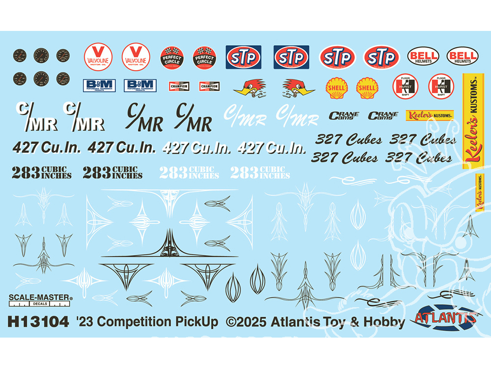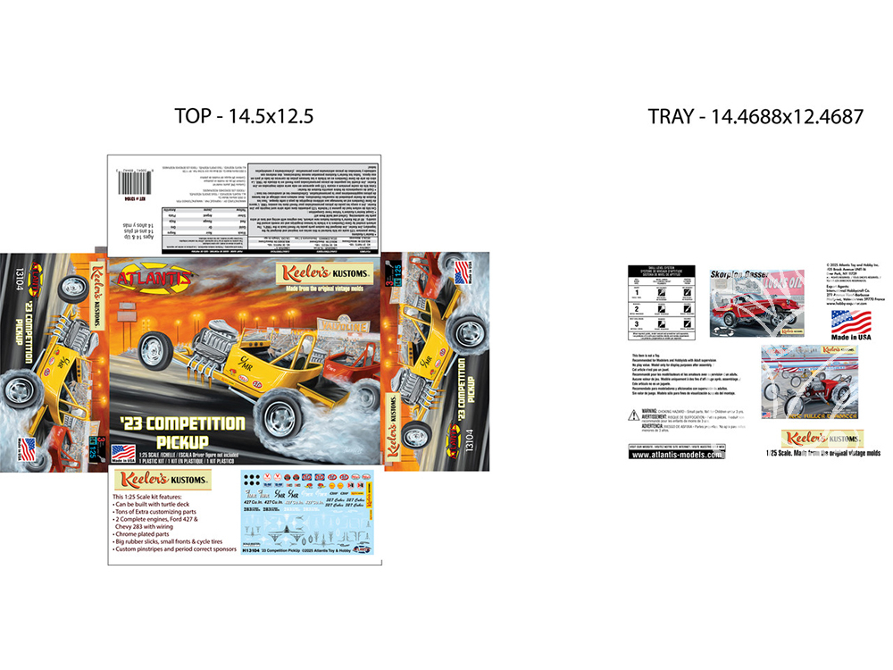Moulée en blanc et chromé, cette maquette est livrée avec 2 moteurs et le câblage. Un kit complet de pièces ! Atlantis s'est associé au légendaire concepteur de modèles réduits automobiles, Jim Keeler. Jim a notamment conçu les Custom Parts Packs pour Revell dans les années 1960. Ce kit est destiné aux maquettistes les plus expérimentés. Il comprend plus de 125 pièces, dont une multitude de pièces de personnalisation supplémentaires, une planche de décalcomanies ultra-détaillée, de gros pneus slicks, des pneus avant plus petits et des pneus cycle.