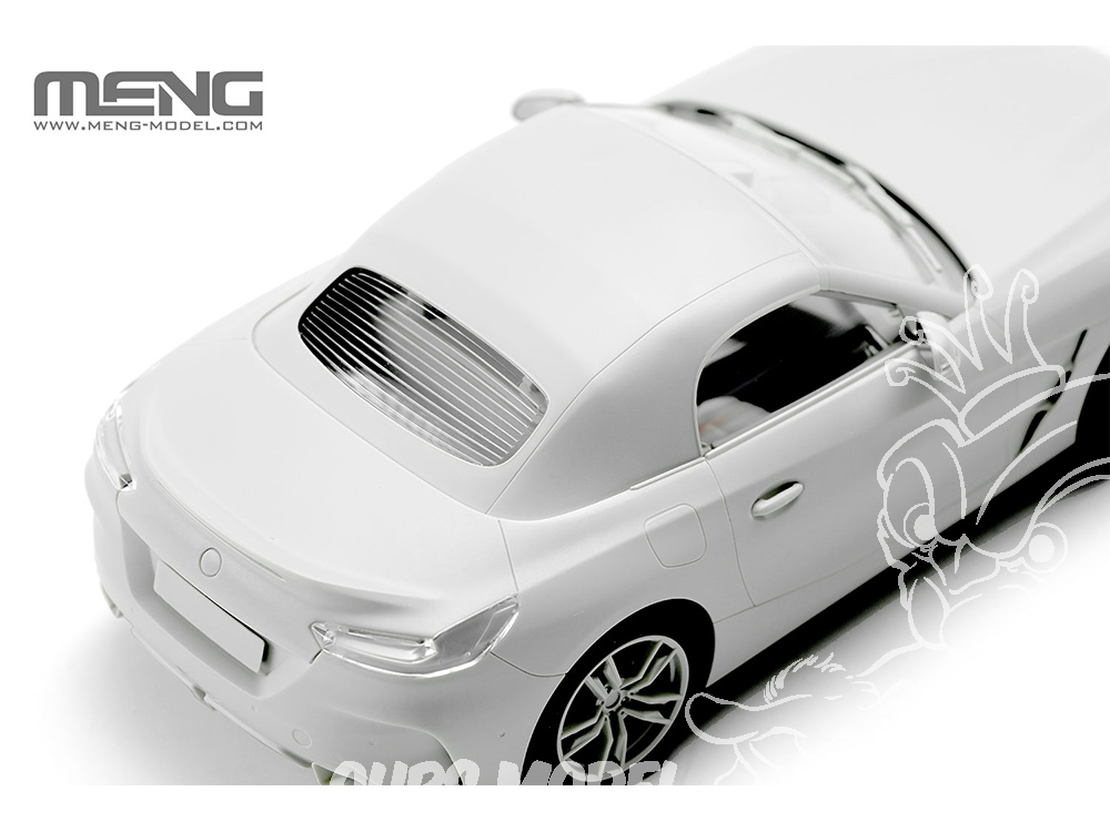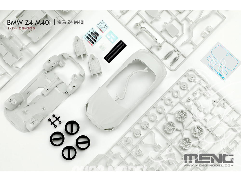 Ce MENG CS-005 BMW Z4 M40i est un kit de modèle en plastique 1/24 sous licence officielle BMW. Le modèle fini mesurera 180 mm de long, 84 mm de large et 55 mm de haut. Ce kit comprend des pièces en PE en acier inoxydable, des ceintures de sécurité en tissu spécial et des autocollants de masque de peinture prédécoupés. La capote du modèle peut être construite en position relevée ou abaissée. Nous avons construit un modèle non peint avec des tirs d'essai. Examinons de près les détails.