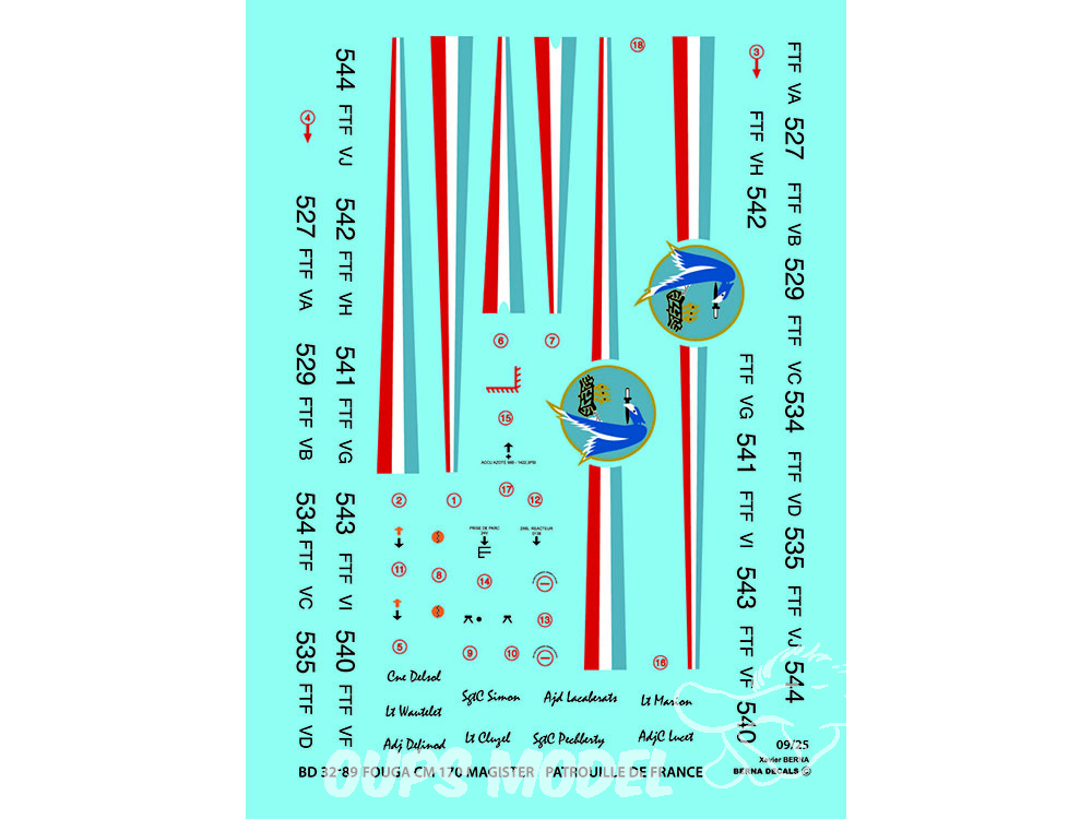 DECALQUES BERNA DECALS BD32-89 Fouga Magister CM170 Patrouille de France 1/32