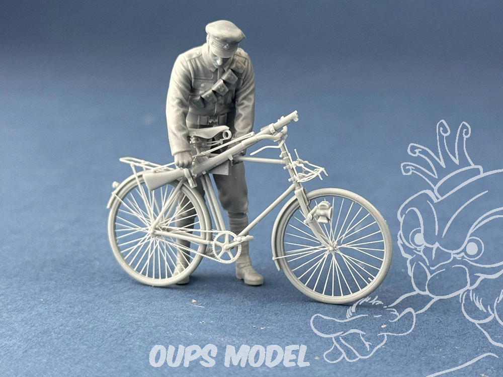 Figurine 3D très détaillée représentant un cycliste de l'armée britannique de la Première Guerre mondiale rangeant son fusil. Idéale pour les dioramas ou les scènes miniatures.