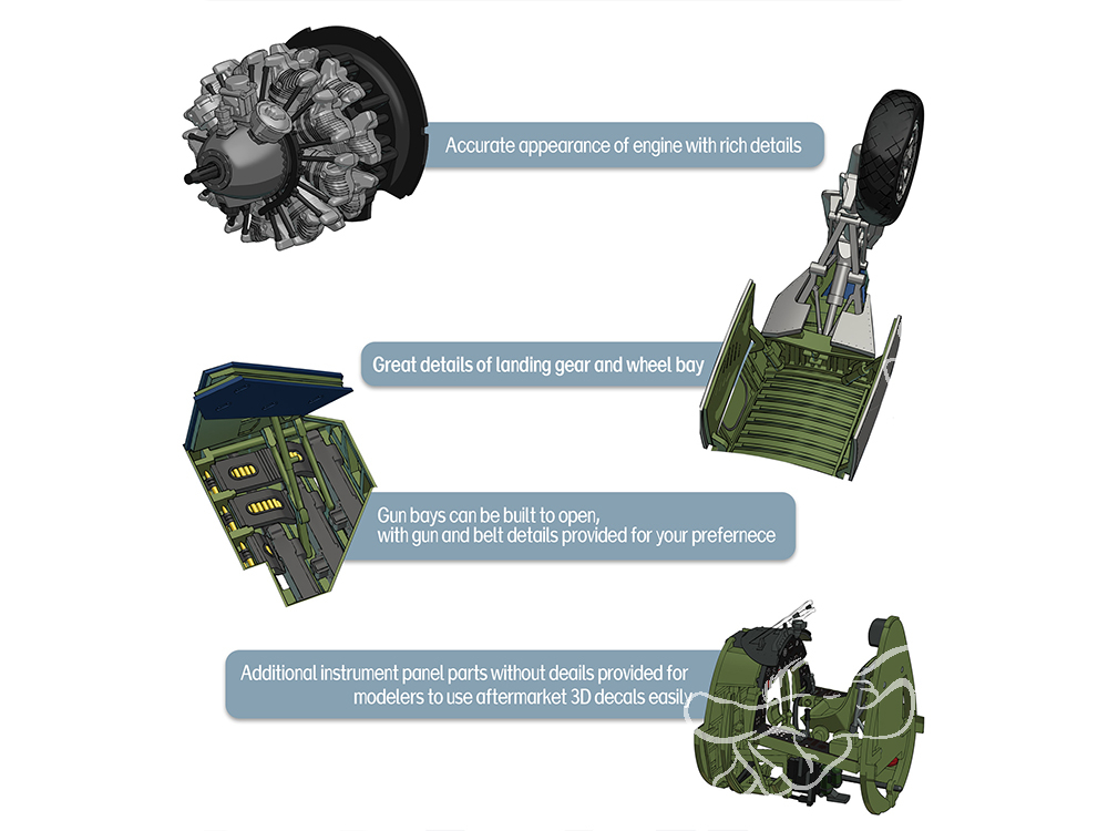 - Les baies d’armement peuvent être montées ouvertes, avec mitrailleuses et bandes de munitions détaillées, selon votre préférence.