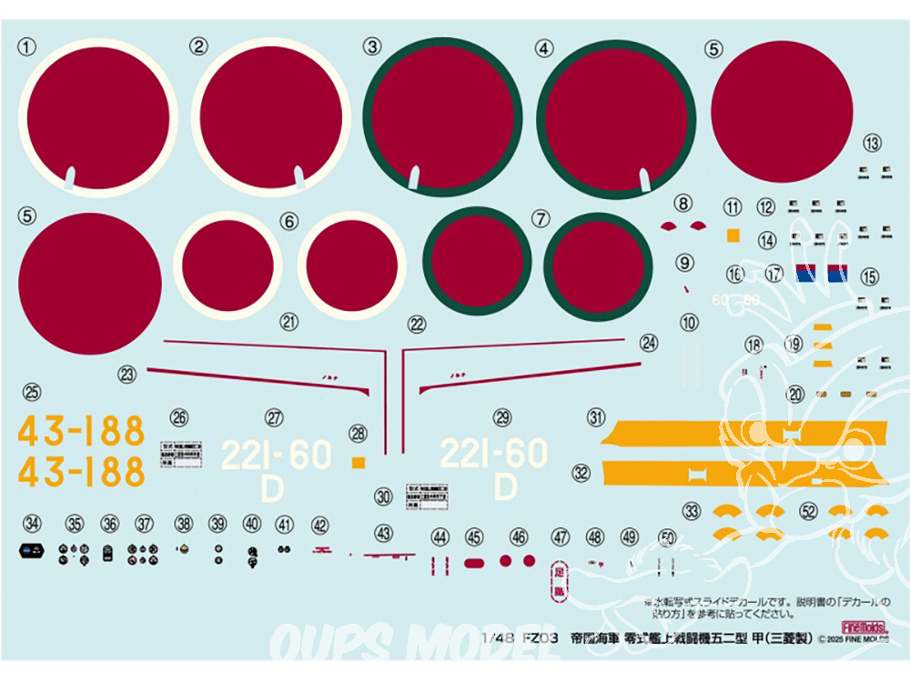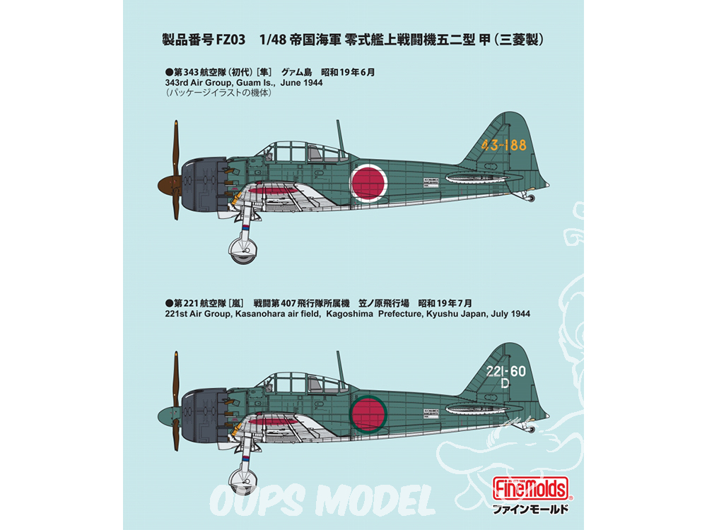 Ce produit reproduit fidèlement ces différences grâce à un nouveau moule. En particulier, la figurine équipée des plaques courtes résistantes à la chaleur de Mitsubishi est représentée pour la première fois sur une maquette plastique de chasseur Zero à l'échelle 1/48. Les marquages incluent des décalcomanies pour les appareils d'origine des 343e et 221e groupes aériens. L'appareil du 343e groupe aérien est actuellement exposé au Centre de relations publiques de la Force aérienne d'autodéfense japonaise à Hamamatsu.