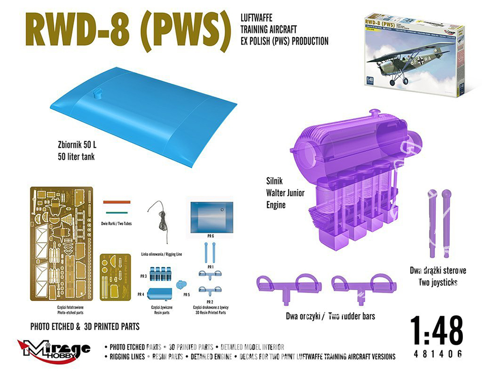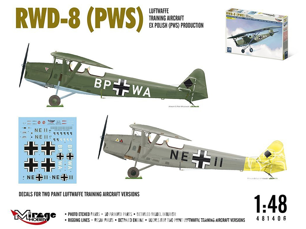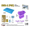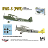 En plus de la version standard, 50 RWD-8a PWS furent construits avec un réservoir de carburant additionnel de 95 litres dans une section centrale d'aile plus épaisse, augmentant l'autonomie de l'avion. Une petite série fut produite avec une place arrière recouverte de rideaux pour permettre d'effectuer des sessions d'entraînement au vol sans visibilité. Une structure avec un crochet pour le remorquage de planeurs pouvait être installée sur l'avion. Plus tard fut conçu le RWD-17, une version plus évoluée destinée à l'entraînement et à l'acrobatie aérienne.