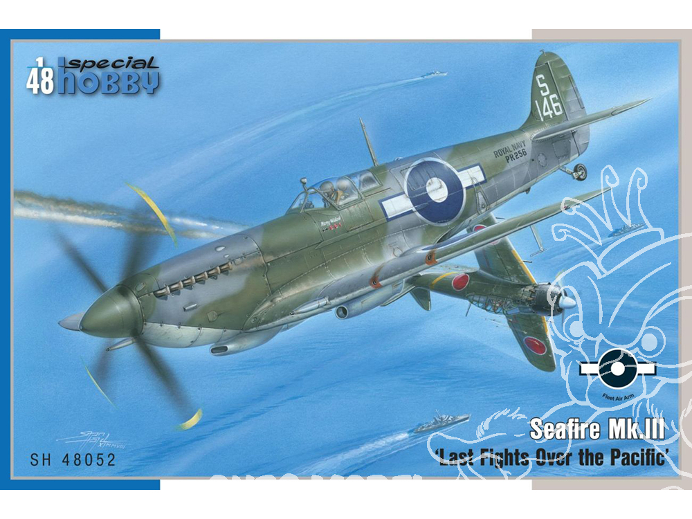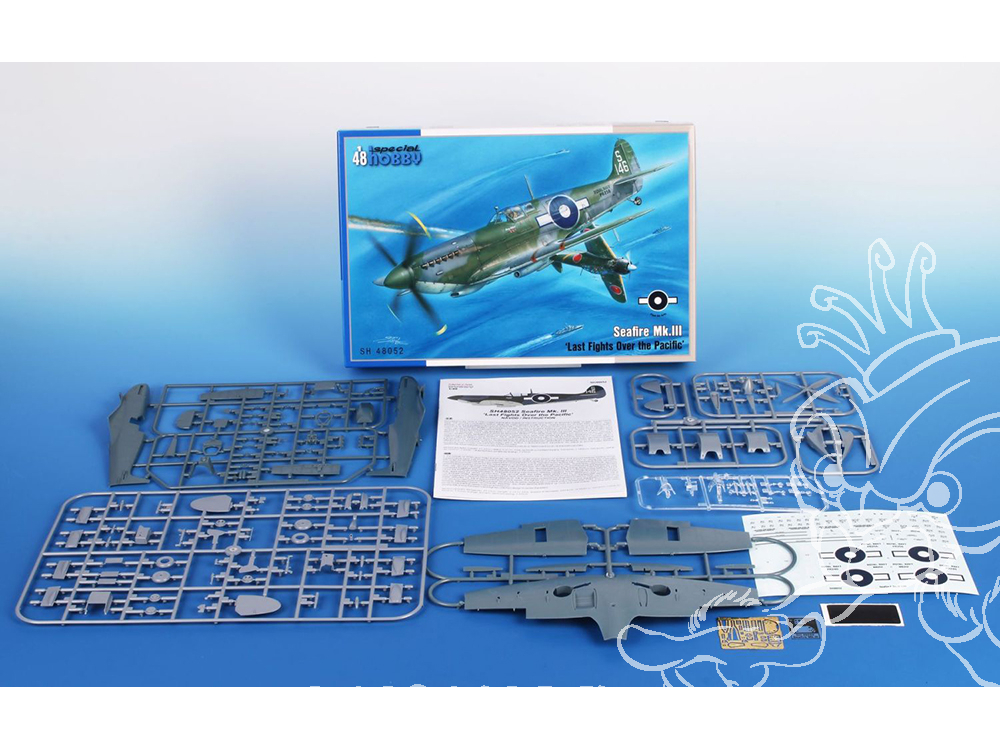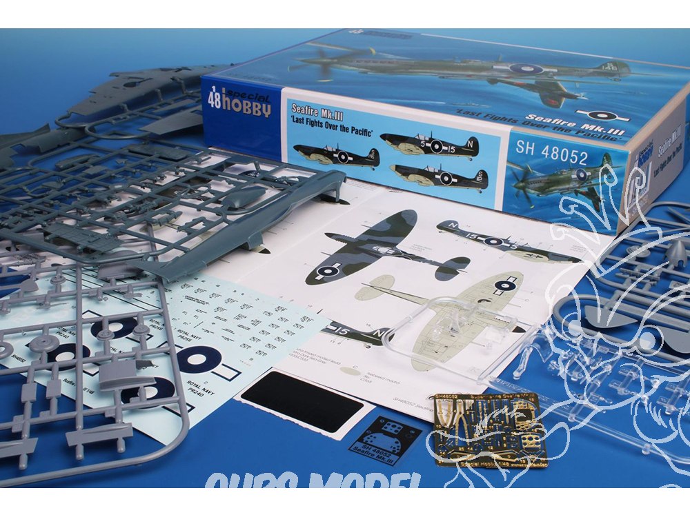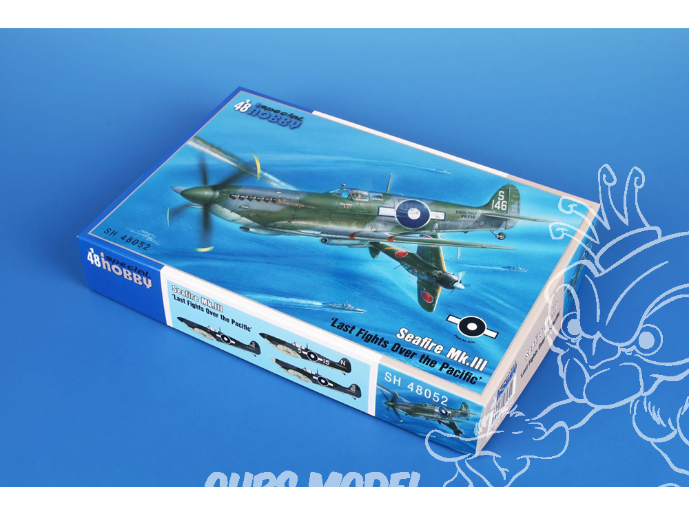 Le chasseur naval Seafire fut créé durant la Seconde Guerre mondiale comme une adaptation navale d'urgence du Spitfire Mk.V. Progressivement, les versions Mk.I à Mk.III furent produites avec des moteurs R&R Merlin (suivies ensuite d'autres versions équipées de moteurs R&R Griffon, désignées Seafire Mk.15, 17, 45, 46 et 47 – Special Hobby propose le Seafire Mk.15, références SH48116 et SH48125). Contrairement aux versions précédentes, le Seafire Mk.III était doté d'une aile repliable. Le moteur R&R Merlin série 45, offrant les meilleures performances à basse altitude, lui conférait des performances supérieures au niveau de la mer à celles du Spitfire Mk.IX moderne. Le Seafire Mk.III devint le meilleur chasseur naval de conception britannique de la Seconde Guerre mondiale. Bien que son train d'atterrissage fragile constituât un handicap certain lors des opérations sur porte-avions, il représentait un adversaire redoutable dans les airs. Les pilotes japonais en firent également l'expérience à la fin de la Seconde Guerre mondiale. Le modèle SH48052 propose trois Seafires opérant sur porte-avions dans le Pacifique. L'un d'eux était piloté par le sous-lieutenant R.H. Reynolds, pilote de Seafire le plus décoré. Un autre appareil participa au tout dernier combat aérien naval britannique de la Seconde Guerre mondiale, le matin du 15 août 1945. Le sous-lieutenant G.J. Murphy y abattit deux Zéros. La boîte contient cinq grappes en plastique gris, une cabine moulée par injection, des pièces photogravées et un film autocollant.
