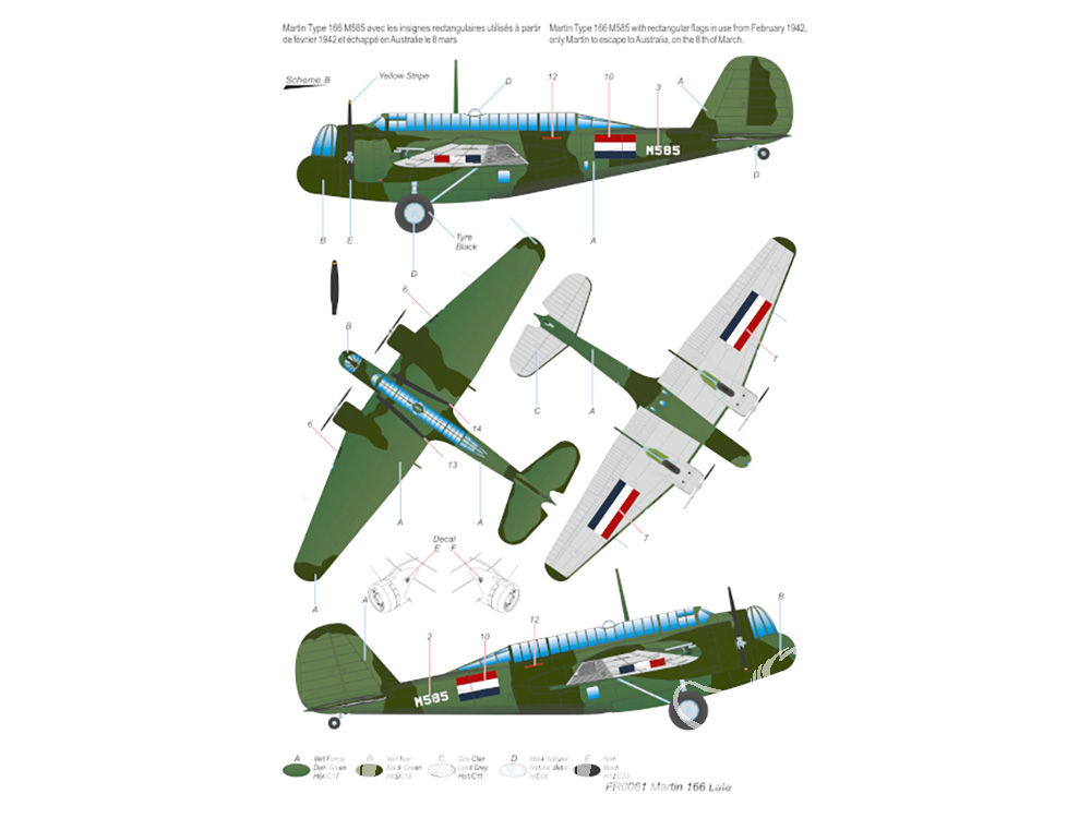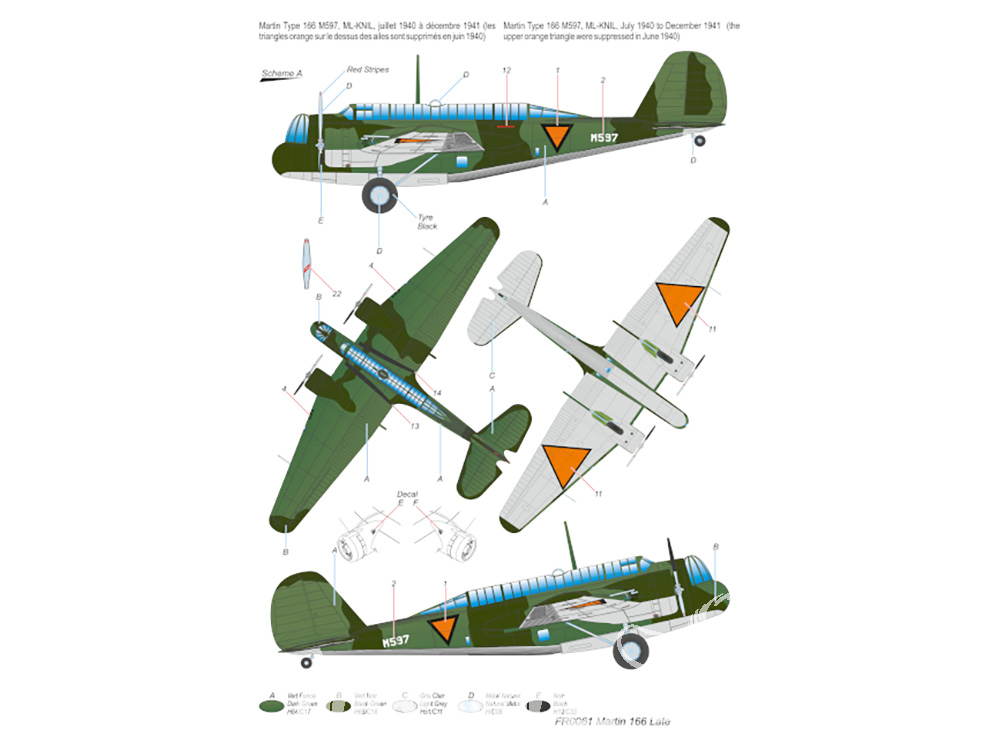 - Martin Type 166 M597, ML-KNIL, juillet 1940 à décembre 1941 (les triangles orange sur le dessus des ailes sont supprimés en juin 1940)