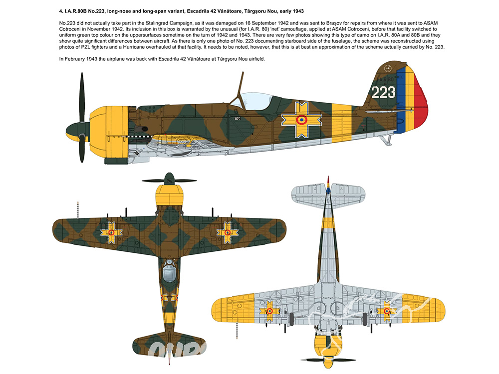 Les IAR.80 et 81 furent les seuls chasseurs roumains de conception propre à participer aux combats de la Seconde Guerre mondiale. Ils se distinguèrent par leur efficacité et leur robustesse, malgré des affrontements avec des appareils techniquement supérieurs de l'USAAF, des forces aériennes soviétiques (VVS), de la Luftwaffe et de l'armée de l'air hongroise. Développés par l'usine Industria Aeronautică Română (I.A.R.) de Brașov, ils s'appuyaient sur l'expérience acquise dans la construction de monoplans métalliques et sur des technologies empruntées au P.11F polonais. Environ 450 exemplaires furent produits en différentes versions, dont le chasseur I.A.R.80 et le chasseur-bombardier I.A.R.81. Ces versions se distinguaient par la longueur du fuselage, l'envergure et l'armement, fruits d'améliorations continues. La version I.A.R.80B, introduite en 1941, bénéficiait d'un armement renforcé (deux mitrailleuses Browning de 13,2 mm et quatre de 7,92 mm) pour mieux contrer les avions soviétiques. Durant la campagne de Stalingrad, les unités roumaines équipées d'I.A.R. 80A, 80B et 81 appuyèrent les opérations allemandes, effectuant des missions d'escorte et des attaques au sol depuis les aérodromes de Tusov et Morozovskaya. Le rude hiver et l'offensive soviétique « Uranus », lancée le 19 novembre 1942, contraignirent les pilotes à combattre dans des conditions extrêmes et à mener des opérations de couverture désespérées. Malgré le courage et l'habileté des pilotes roumains, les unités de l'I.A.R. subirent de lourdes pertes et furent rapatriées en janvier 1943, mettant ainsi fin à leur participation à l'une des batailles les plus féroces de la Seconde Guerre mondiale.