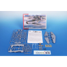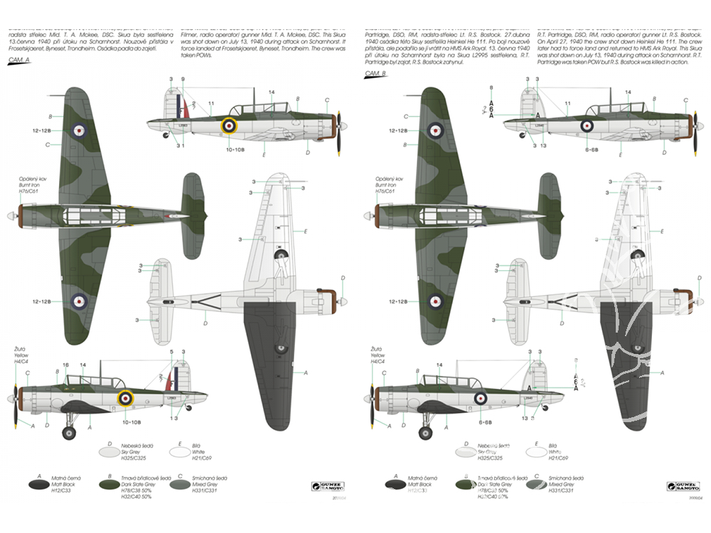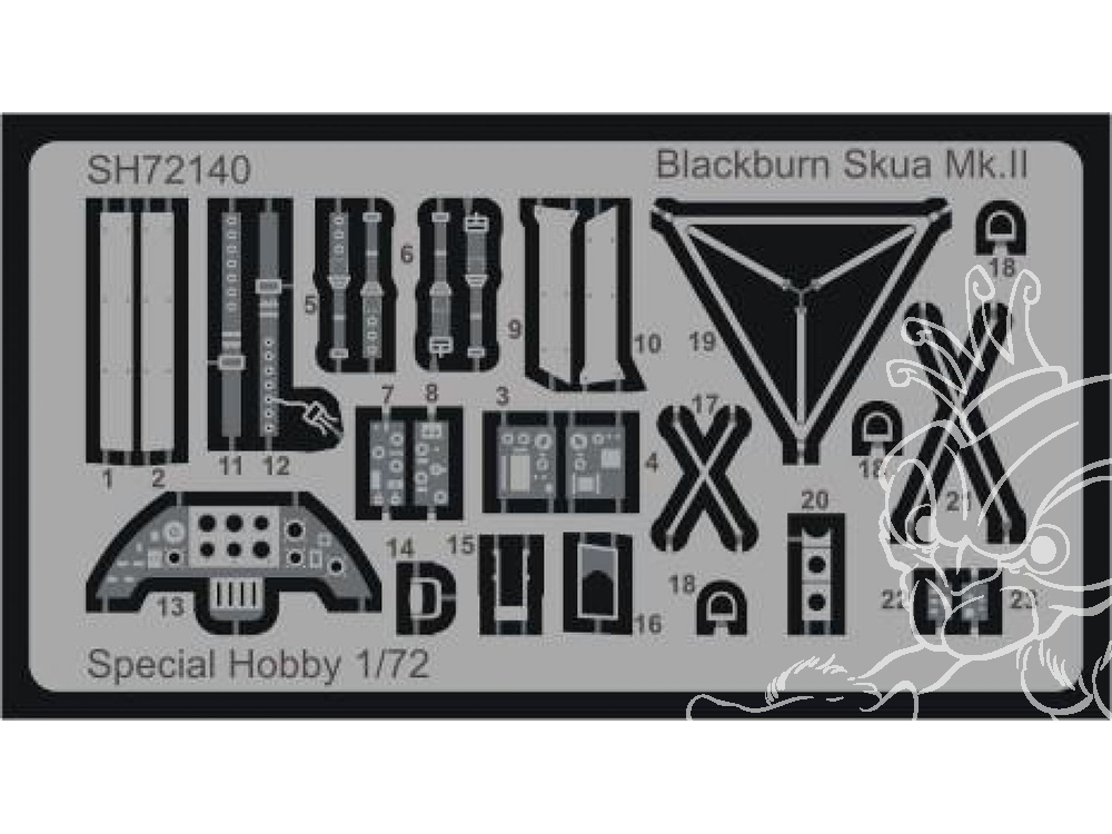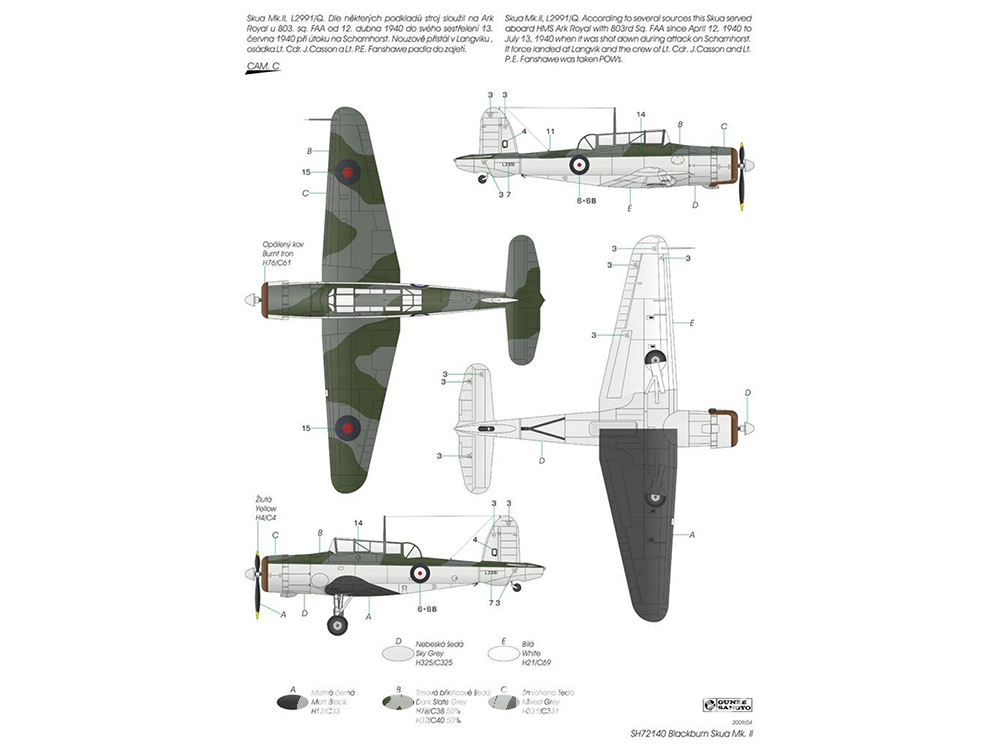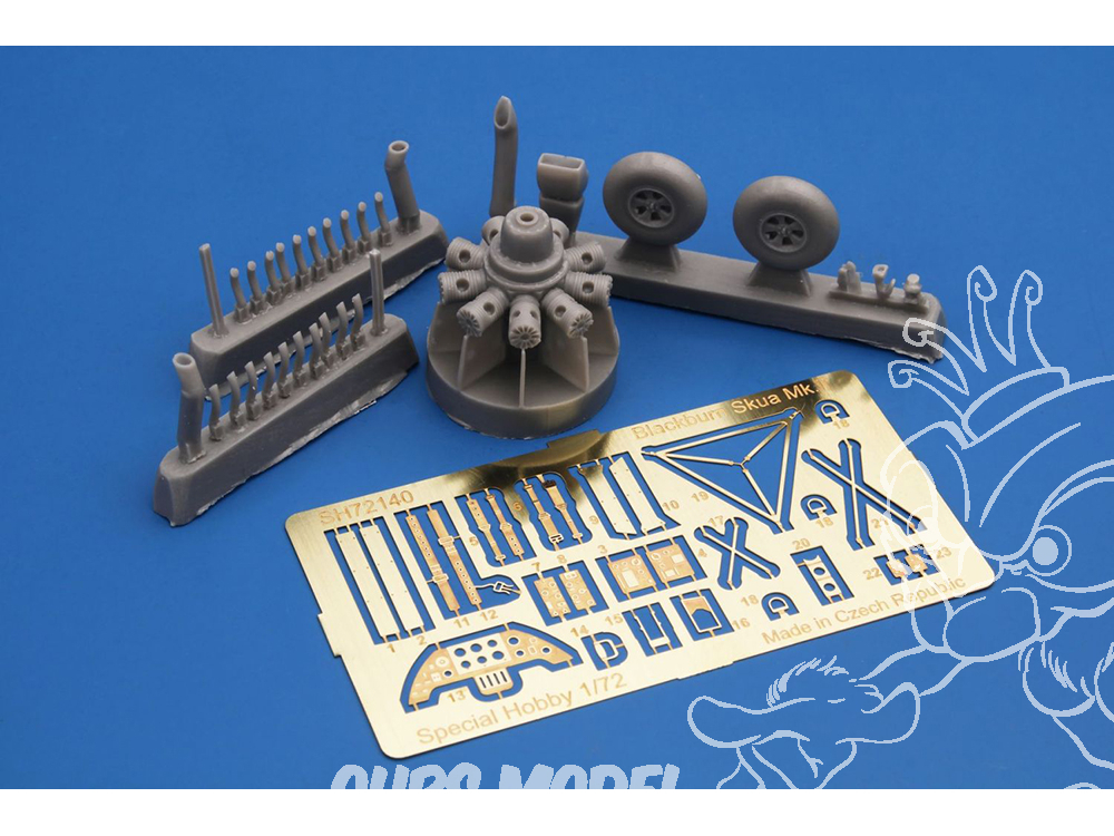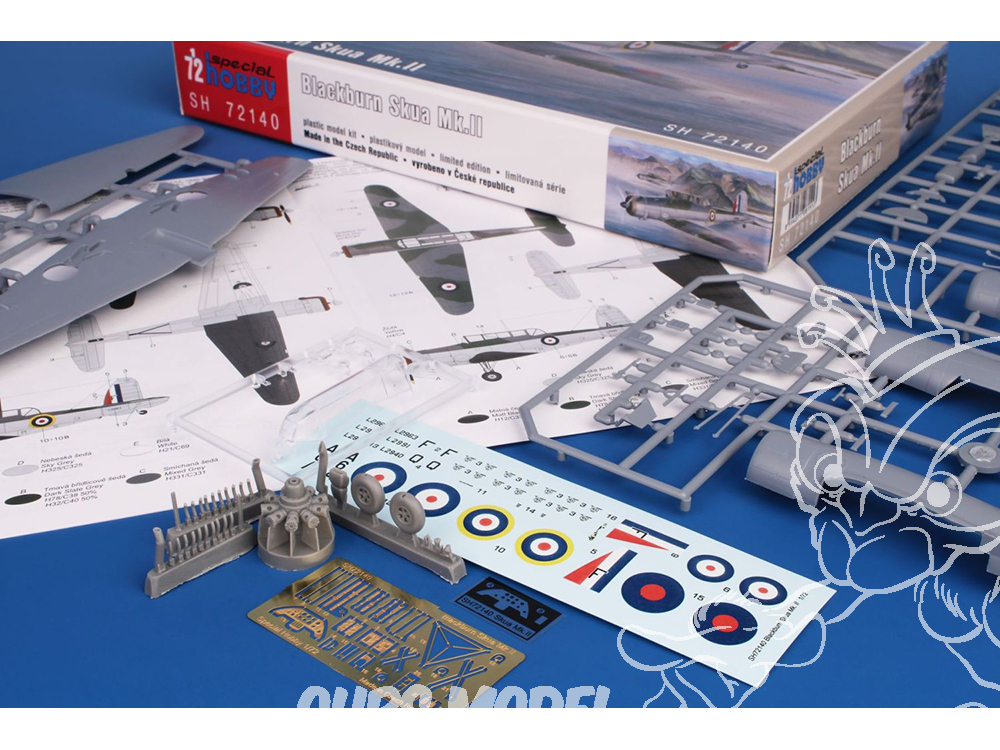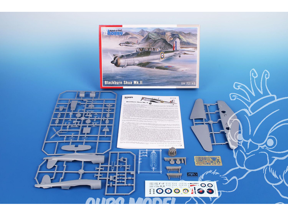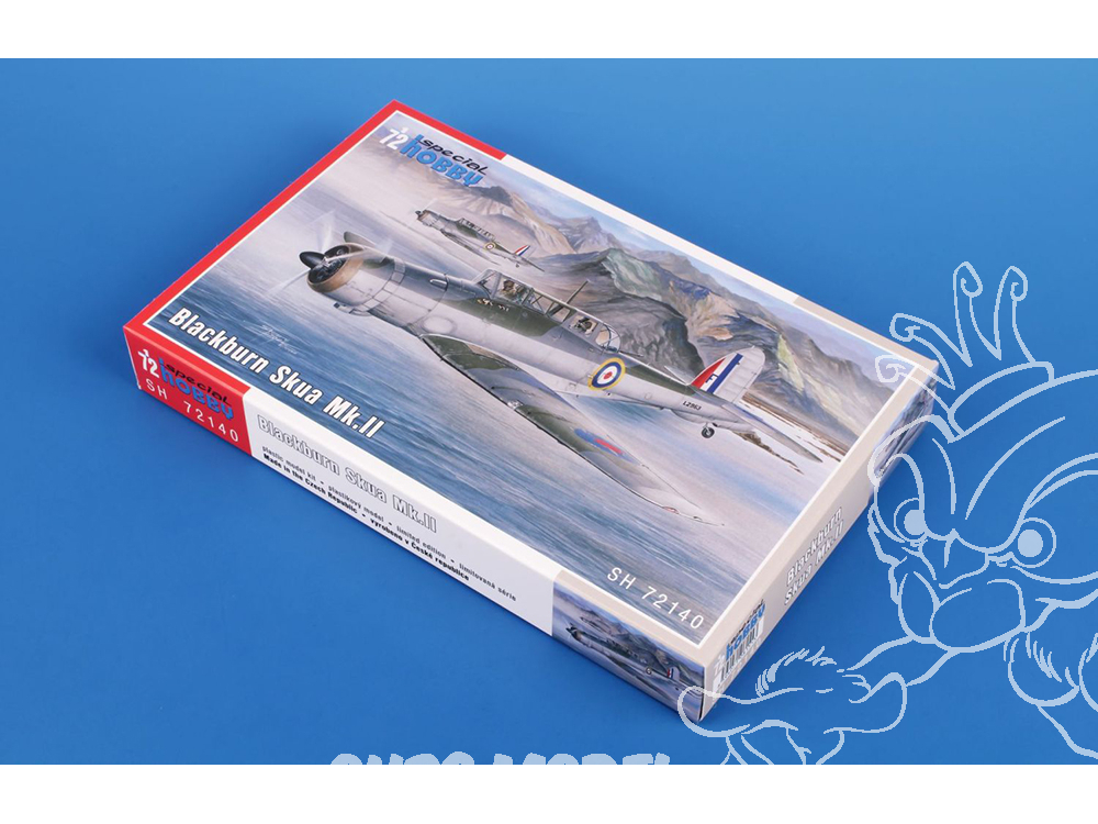 En 1934, le ministère de l'Air publia le cahier des charges O.27/34, définissant les exigences relatives à un avion multirôle destiné à être utilisé à bord de porte-avions. Cet appareil devait être opérationnel aussi bien comme chasseur que comme bombardier en piqué. Dans la conception britannique de l'époque, un chasseur embarqué était un biplace conçu pour les missions de longue durée et le combat contre les avions de reconnaissance ennemis. Le combat contre les bombardiers ennemis, et a fortiori contre les chasseurs, n'était pas envisagé. Le projet B.24, conçu par l'ingénieur G.E. Petty, concepteur en chef de la société Blackburn, fut retenu comme le meilleur. Petty avait conçu un avion à aile basse entièrement métallique, doté d'ailes repliables et d'un train d'atterrissage rétractable. Sous le fuselage, l'appareil comportait une crosse d'appontage et un logement pour une bombe de 226 kg maximum. Le premier prototype, baptisé Skua Mk.I, effectua son premier vol le 9 février 1937. Après des essais concluants, la production en série commença immédiatement. Les appareils de série étaient propulsés par des moteurs Bristol Perseus XII et désignés Skua Mk.II. Ils furent livrés aux escadrilles de chasse n° 800, 801, 803 et 806, et fournis également aux escadrilles d'entraînement et aux unités de remorquage de cibles. Malgré une production accélérée, ils furent considérés comme obsolètes pour la chasse. Dès le début de la guerre, les Skua entrèrent rapidement en action, opérant depuis des porte-avions et des bases terrestres. Lors du premier bombardement d'un sous-marin allemand, le 14 septembre, deux Skua d'une section de trois appareils furent perdus à cause de leurs propres bombes de mauvaise qualité. Le 26 septembre, deux appareils de l'escadrille n° 803 abattirent un Dornier Do 18 ennemi. Il s'agissait de la première victoire aérienne britannique confirmée de la Seconde Guerre mondiale. Le Skua est étroitement associé à d'autres premières. Lors de la campagne de Norvège, le 10 avril 1940, seize Skua coulèrent le croiseur allemand Königsberg. L'escadrille n° 800, commandée par le capitaine R.T. Le Partridge et le 803e escadron, commandés par le lieutenant W.P. Lucy, décollèrent de Hatston, dans les Orcades. Ce fut la première attaque aérienne réussie contre un cuirassé durant la Seconde Guerre mondiale. Les Skua participèrent à la bataille de Dunkerque et, embarqués à bord du HMS Ark Royal, intervinrent dans les combats en Méditerranée. Le 3 juillet 1940, un Skua de l'Ark Royal affronta des chasseurs français, un ancien allié. Il devint le premier avion britannique à combattre les Français et le premier à être perdu dans cette guerre non déclarée. Les derniers Skua furent retirés du HMS Ark Royal en avril 1941. Ils furent ensuite affectés à des escadrilles non combattantes. Leur carrière de combat fut relativement courte, mais malgré leurs faibles performances en chasse, plusieurs as totalisèrent plus de cinq victoires à leur actif. En tant que bombardiers, ils auraient pu connaître un bien meilleur succès, mais l'Amirauté ne les a pas utilisés à leur plein potentiel, au détriment de la Royal Navy. Nous remettons ce modèle à la vente après plusieurs années d'absence. Deux grappes de plastique gris sont reliées par une grappe de pièces transparentes, de photodécoupes et de pièces PUR détaillées. Des décalcomanies sont fournies pour trois appareils arborant le camouflage de la FAA.