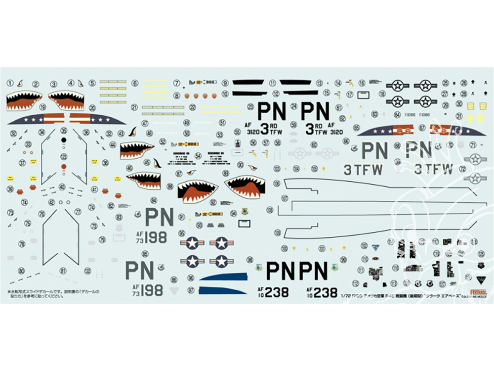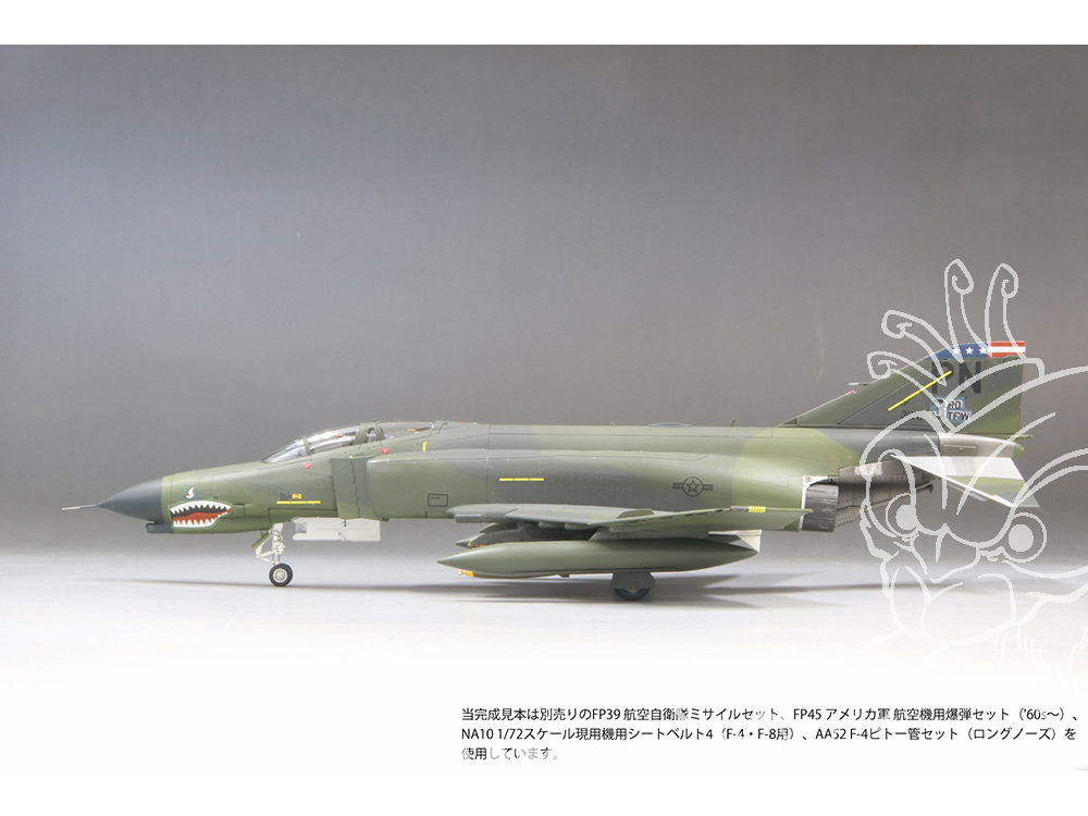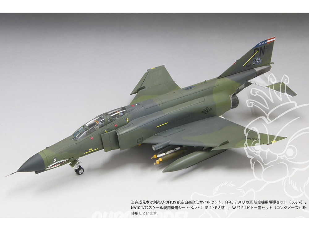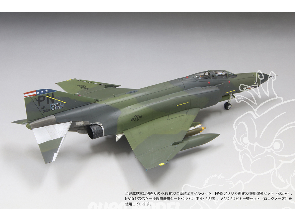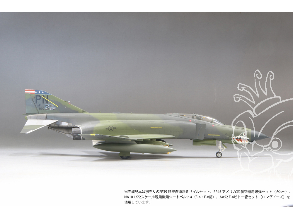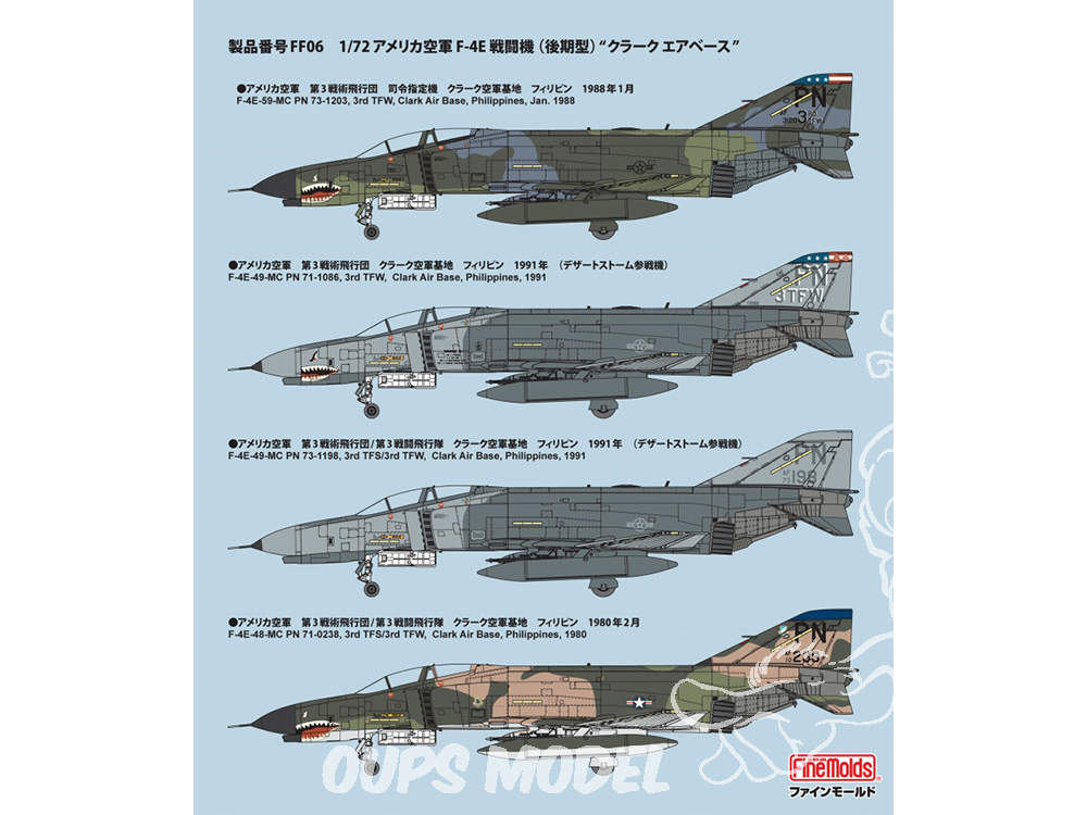 Les décalcomanies fournies présentent les marquages de la 3e escadre tactique (3TFW) des forces aériennes américaines du Pacifique, déployée sur la base aérienne de Clark aux Philippines après la guerre du Vietnam. Le 3e escadron de chasse (3TFS), qui lui était subordonné, a contribué à la stabilité de la mer de Chine méridionale pendant de nombreuses années, dans le but de dissuader le Vietnam et l'Union soviétique. Le F-4E, avec son long nez et sa forme caractéristique de dents de requin, est un appareil bien connu au Japon, effectuant fréquemment des vols vers les bases aériennes de Yokota et de Kadena. L'illustration de l'emballage représente une scène sur le tarmac de la base aérienne de Clark vers 1984.