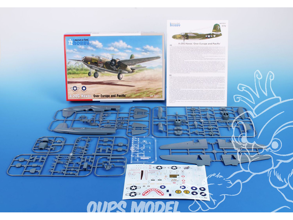 Les bombardiers bimoteurs américains A-20 Havoc/Boston furent déployés sur de nombreux champs de bataille de la Seconde Guerre mondiale. Ils connurent un grand succès dans le Pacifique. La version A-20G était équipée d'une tourelle avant armée de mitrailleuses de gros calibre, tandis que l'hémisphère arrière était protégé par une tourelle double équipée de mitrailleuses du même calibre. Cet armement était utilisé pour les attaques en profondeur, ainsi que pour les largages de bombes à basse altitude. Outre les appareils américains, des Boston de la RAAF furent également déployés dans le Pacifique. Les Boston australiens organisèrent des démonstrations de force aériennes spectaculaires, parfois appelées « tea parties ». En Europe, les A-20G opéraient depuis des bases en Italie et en Grande-Bretagne en tant que bombardiers tactiques au sein de grandes formations. Ils étaient généralement précédés d'A-20K dotés d'un nez vitré et de viseurs Norden. Après le débarquement en Europe, les A-20G opéraient également depuis des bases françaises. C'est le cas de l'un des appareils proposés dans nos maquettes. Cet appareil, orné de bandes d'invasion, était décoré d'une illustration d'une beauté selon Vargas. Trois autres appareils furent engagés dans le Pacifique. Deux appareils américains arboraient des décorations sur le nez, dont une représentant un canon. Le dernier appareil appartenait au 22e escadron de la RAAF.