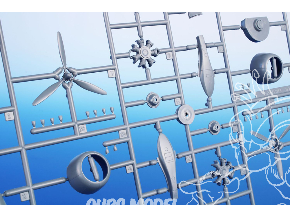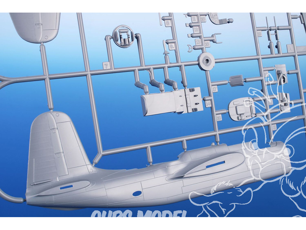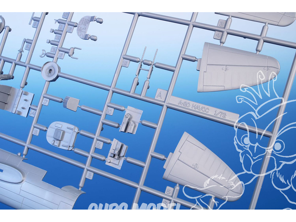 La maquette propose des pièces moulées détaillées pour l'A-20G, réparties en cinq grappes de plastique gris et une grappe de pièces transparentes.