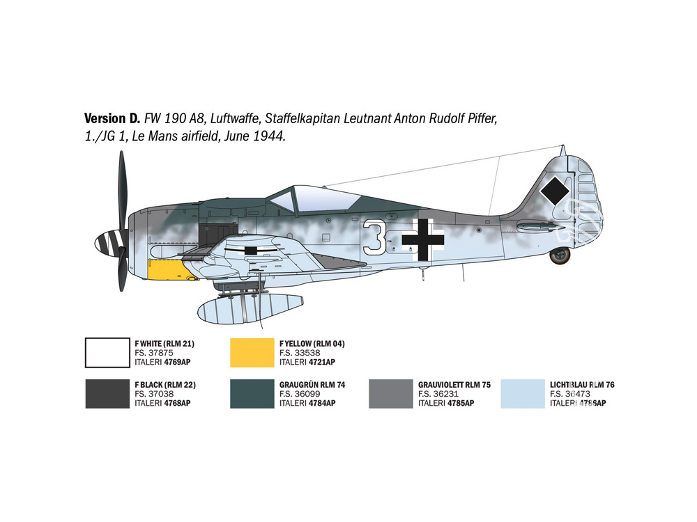 Le Focke-Wulf Fw 190 fut l'un des meilleurs avions conçus durant la Seconde Guerre mondiale. Produit à plus de 20 000 exemplaires à partir de 1941, il fut, avec le Messerschmitt Bf 109, le chasseur le plus célèbre de la Luftwaffe. Le Focke-Wulf Fw 190 A-8 était propulsé par un moteur radial BMW 801 D-2 à double étoile, développant 1 700 ch et 14 cylindres, lui permettant d'atteindre une vitesse maximale de 653 km/h. Son armement était conséquent : deux mitrailleuses MG 131 et quatre canons MG 151 de 20 mm. Début 1944, la version A-8 entra en production, dotée d'un système d'injection de carburant capable d'augmenter brièvement la puissance du moteur à plus de 1 900 ch. Les meilleurs pilotes de la Luftwaffe volèrent à bord de ce chasseur légendaire durant la Seconde Guerre mondiale.