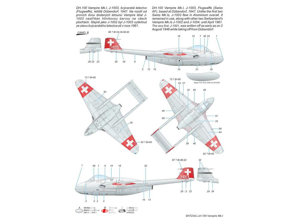 Le modèle aux couleurs des états neutres offre un total de quatre marquages. Deux machines aux couleurs de la Swiss Flugwaffe, toutes deux avec des croix blanches dans des carrés rouges. Le J-1002 a volé dans un mélange de gris moyen de mer et de bleu PRU, J-1003 dans le jet en aluminium. En Suède, le vampire a été appelé J-28A et a volé camouflé du haut vert et gris du fond. Les machines se distinguent par le signe, le premier est le E rouge, le 1er escadron, Wing 13 et le deuxième L jaune, 3rd escadron, Wing 3.