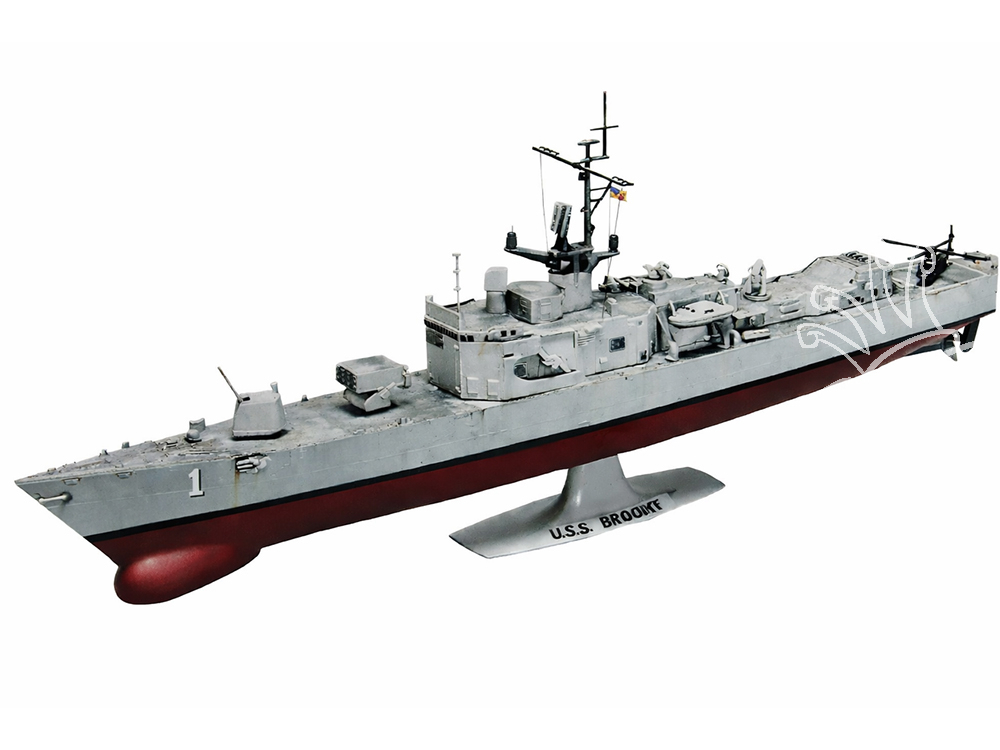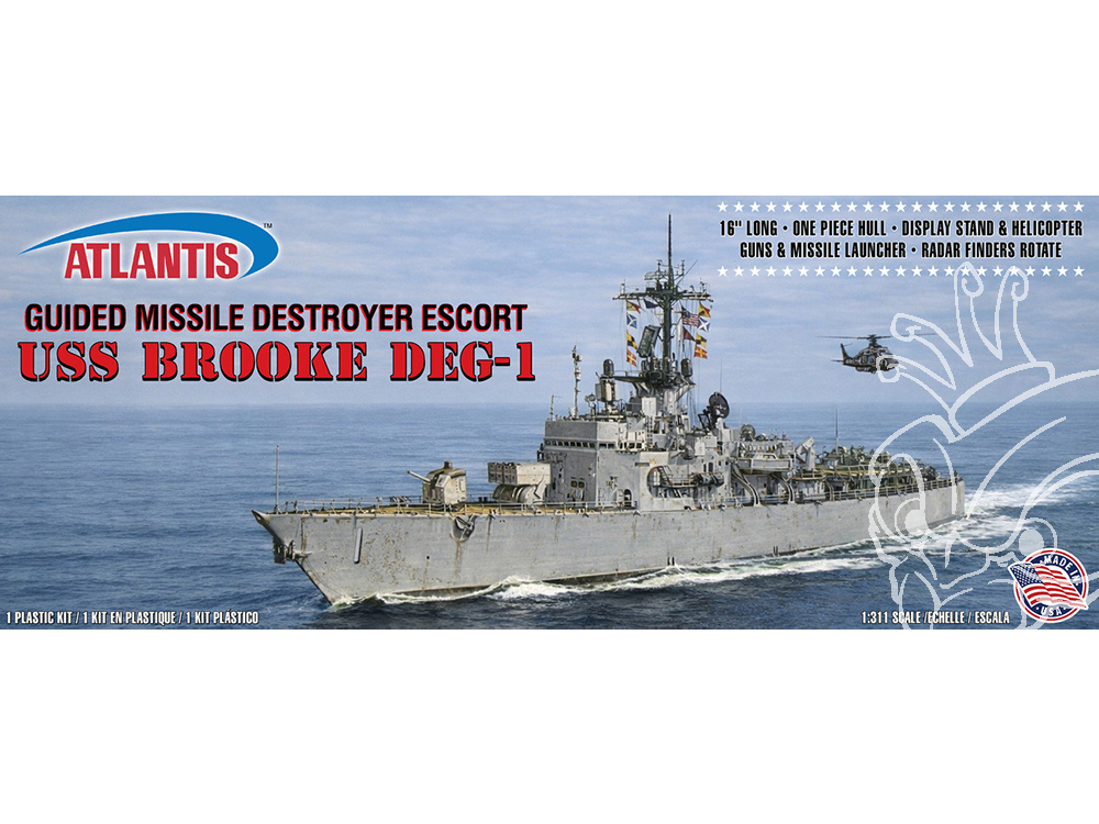 Le destroyer lance-missiles Brooke a été conçu pour protéger les forces amphibies, patrouiller les eaux côtières et défendre les convois militaires contre les sous-marins ennemis. Premier d'une nouvelle classe de navires d'escorte dotés à l'époque d'une capacité antiaérienne grâce aux missiles guidés Tartar, il était armé de roquettes anti-sous-marines ASROC, de torpilles anti-sous-marines et d'un canon de 127 mm. Équipé d'un sonar, il embarquait également un hélicoptère anti-sous-marin Seasprite. Le Brooke mesurait 126,3 mètres de long et 13,4 mètres de large. Son déplacement à pleine charge dépassait 34 026 tonnes et son tirant d'eau était de 7,3 mètres. Cette maquette réaliste mesure 40,6 cm de long. Moulée en gris, elle présente une nouvelle illustration de boîte avec le nouveau logo Atlantis.