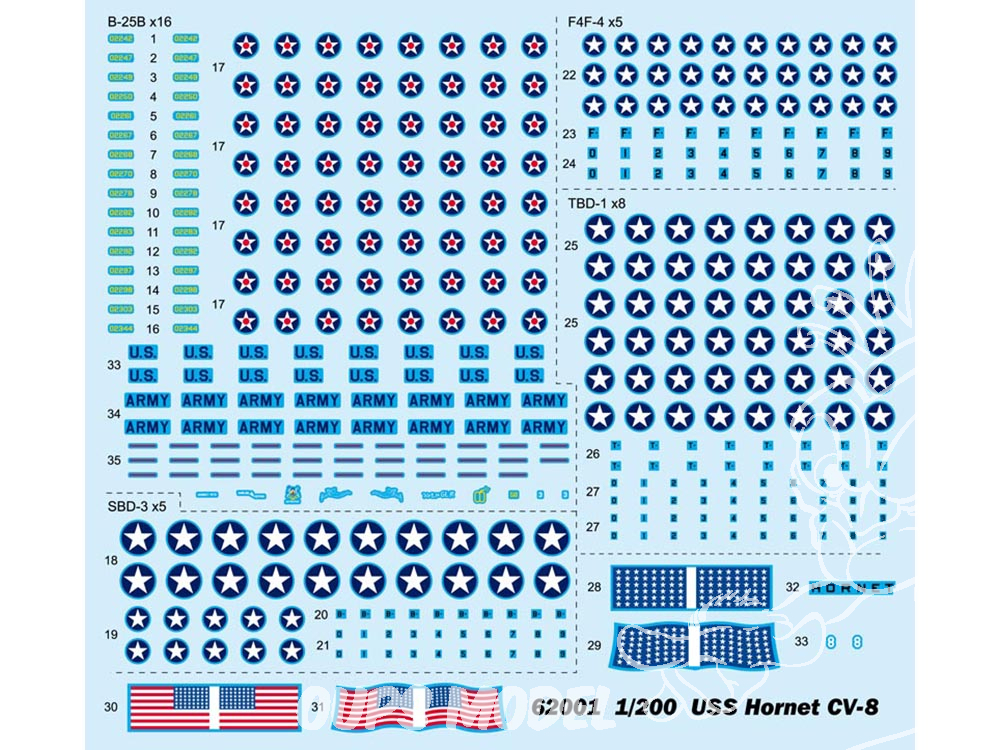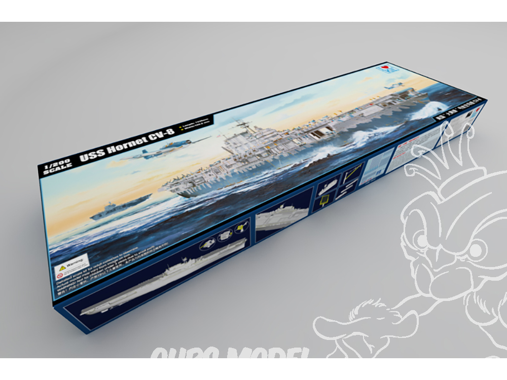 L’USS Hornet (CV-8) est un porte-avions américain, quatrième et dernier de la classe Yorktown, entré en service en 1941. Le Hornet s’est rendu célèbre pendant la Seconde Guerre mondiale, le 18 avril 1942, en lançant les seize bombardiers B-25 Mitchell qui allaient réaliser le premier raid aérien sur Tokyo, dit raid de Doolittle. Décollant du pont de l’USS Hornet, les avions allaient bombarder Yokohama et Tokyo avec pour objectif de poursuivre jusqu’à des terrains d’aviation en Chine. L’USS Hornet participe ensuite à la bataille de Midway. Il sera coulé en octobre 1942 à la bataille des îles Santa Cruz où il est attaqué par une force aérienne largement supérieure en nombre. Le nom USS Hornet sera alors donné au 12e porte-avions américain, en cours de construction, qui sera mis à l’eau en 1943. Le kit contient plus de 1290 pièces dont les canons et les chaines en métal. Pièces en photo découpe (10 planches- rambardes, radars...etc...) Longueur: 1.24m , largeur: 17cm La coque est réalisée en une seule pièce. Le pont est en deux parties. Le kit est remarquablement bien détaillé.L