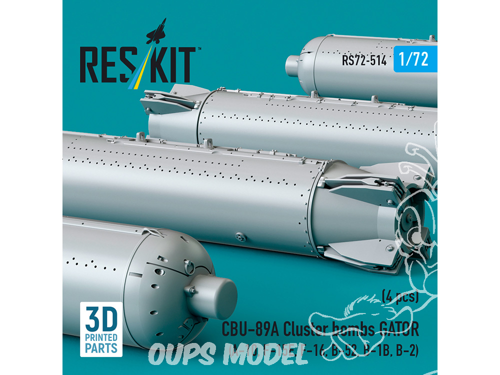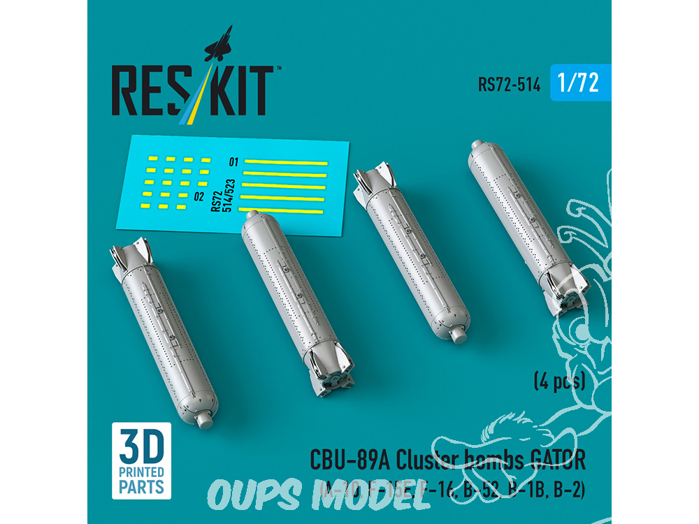 ResKit kit RS72-0514 Bombes à fragmentation CBU-89A GATOR 4 pièces imprimées en 3D 1/72