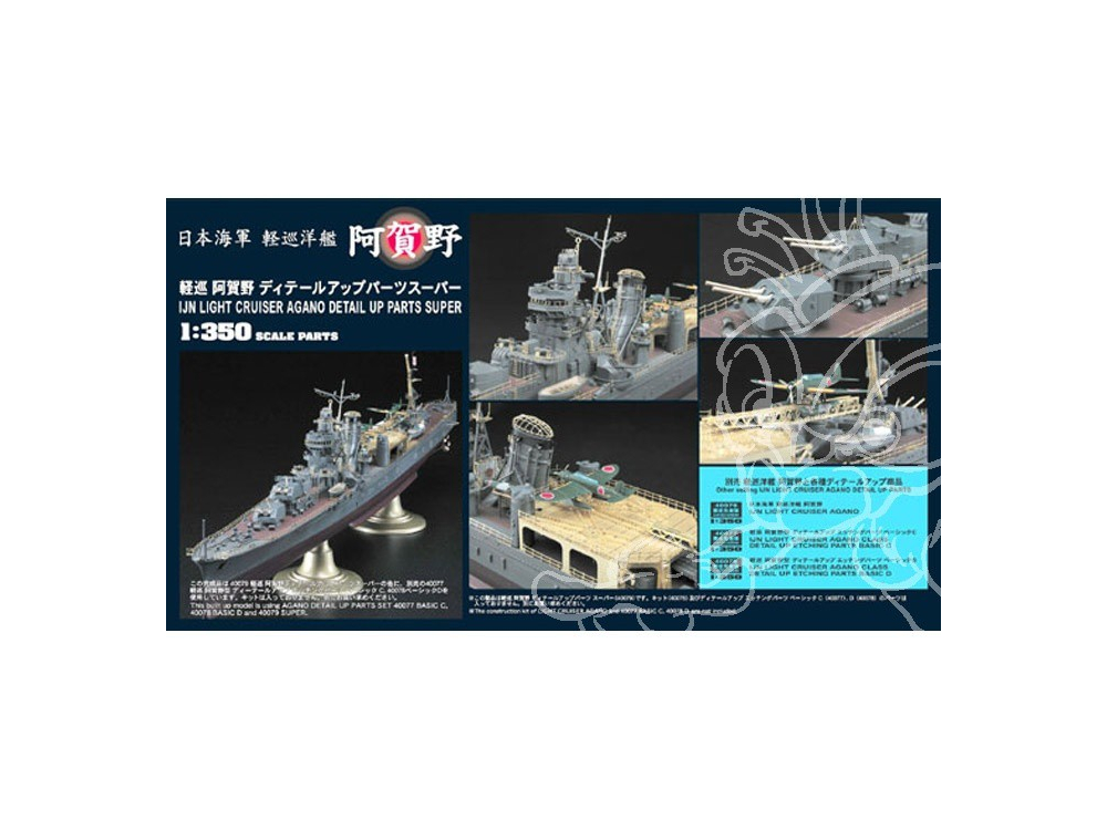 1/350 IJN LIGHT CRUISER AGANO DETAIL UP PARTS SUPER Same size as 40075 (190 x 340 x 40) Photoetched parts - size: 170 mm x 269 mm (catapult, flight deck, airplane parts etc …) Brass parts (brass gun barrel parts x 6 pcs.) Aluminum name plate
