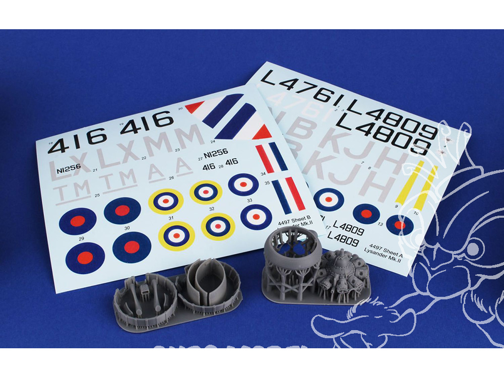 Les Lysander Mk.I/III étaient propulsés par des variantes du moteur Bristol Mercury, tandis que la version Lysander Mk.II était équipée du moteur radial Bristol Perseus. Ce moteur possédait également un capot moteur différent. L'ensemble de ces éléments, ainsi que les décalcomanies, est proposé dans notre kit imprimé en 3D. Les décalcomanies représentent trois appareils de la RAF en service en Europe, dans les îles Britanniques, et un appareil de la RCAF (Force aérienne royale canadienne).