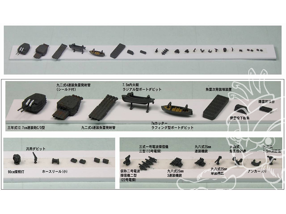 ・Pièces : modèle 3 12,7 cm double canon C/D x 6 (pièces neuves), bossoir de bateau de type radial x 8 (pièces neuves), lance-torpilles quadruple type 92 x 4, mitrailleuse triple type 96 25 mm × 10, type 96 25 mm mitrailleuse double × 4, mitrailleuse simple de type 96 25 mm × 26, nom provisoire détecteur radio n° 2 (sonde électrique n° 22) × 2, détecteur radio n° 1 de type 3 (sonde électrique n° 13) × 2, type 96 télémètre de 1,5 m × 2, chargeur secondaire de torpilles × 2, rail de chute de charge de profondeur × 4, plate-forme de chargement de charge de profondeur × 4, lanceur de charge de profondeur de type 94 × 4, projecteur de 90 cm × 4, coupeur de 7 m × 4, bateau de pompier interne de 7,5 m × 4, bossoir de bateau de type relevable × 8, bossoir à usage général × 6, ancre (petite) × 4, dévidoir (petit) × 12, boîte de munitions de mitrailleuse 25 mm (grande) × 8, boîte de munitions de mitrailleuse 25 mm (petite) x8