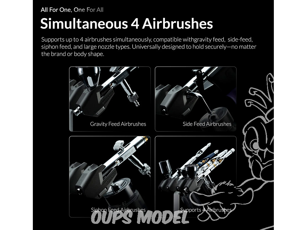 Chacun des quatre ports de sortie dispose d'un contrôle de pression indépendant, permettant de passer instantanément d'un aérographe, d'une taille de buse ou d'un style de peinture à l'autre, sans avoir à régler le compresseur. La conception antichute assure un positionnement sûr, tandis que la base nano-grip assure une utilisation stable et sans pince sur toutes les surfaces : verre, bois, métal ou plastique.