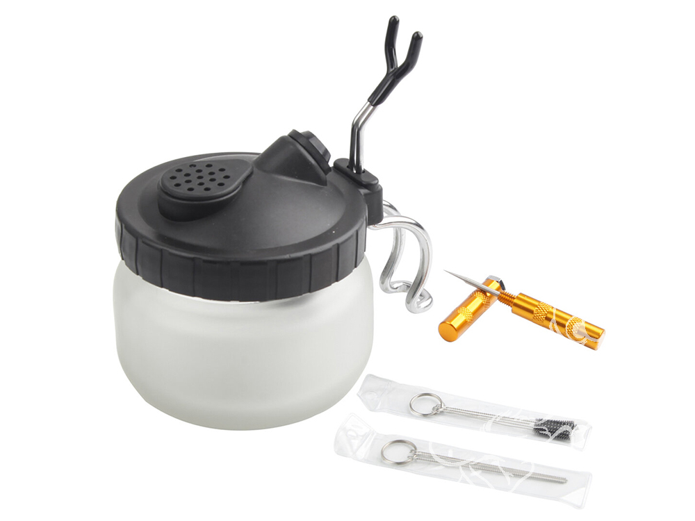 Pot de nettoyage Deluxe 3 en 1 pour aérographe avec support. Ce pot de nettoyage peut également être utilisé comme support pour aérographe.