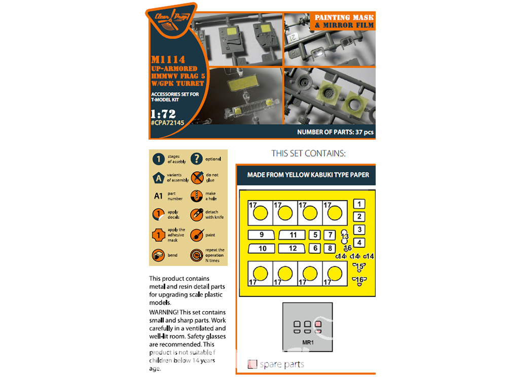 Clear Prop militaire CPA72145 Masque peinture M1114 Tourelle HMMWV Frag 5 W/GPK papier kabuki jaune kit T-Model 1/72