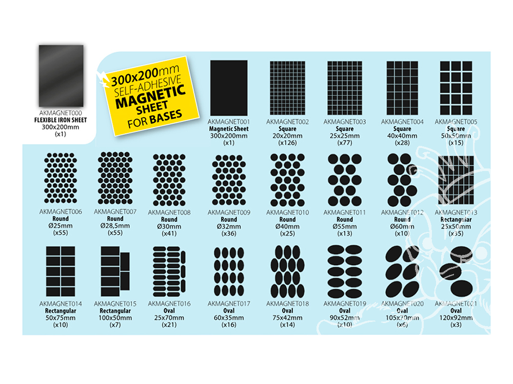 Plaques magnétiques autocollantes prédécoupées pour figurines de jeu. Ces feuilles ont une surface de 300 × 200 mm et sont prédécoupées aux dimensions standard des socles de jeux de guerre.