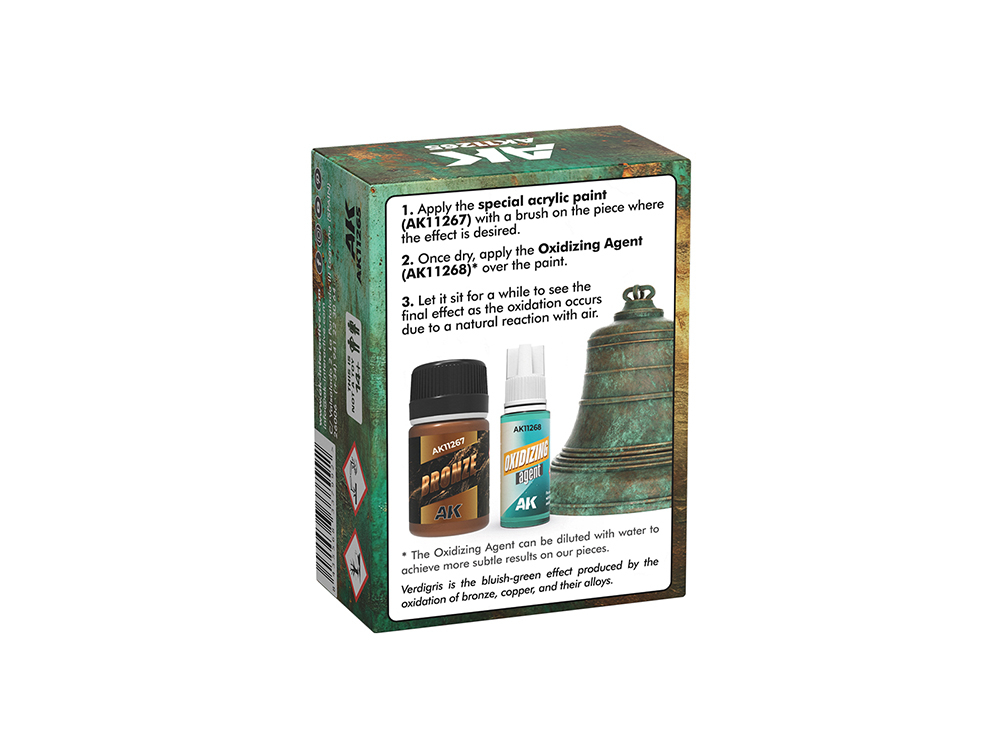 * L'agent oxydant peut être dilué à l'eau pour obtenir des résultats plus subtils sur vos pièces. Le vert-de-gris est l'effet bleu-vert produit par l'oxydation du bronze, du cuivre et de leurs alliages. Vous pouvez accentuer cet effet avec d'autres produits de modélisme tels que des pigments, des peintures acryliques, des effets émaux, etc.