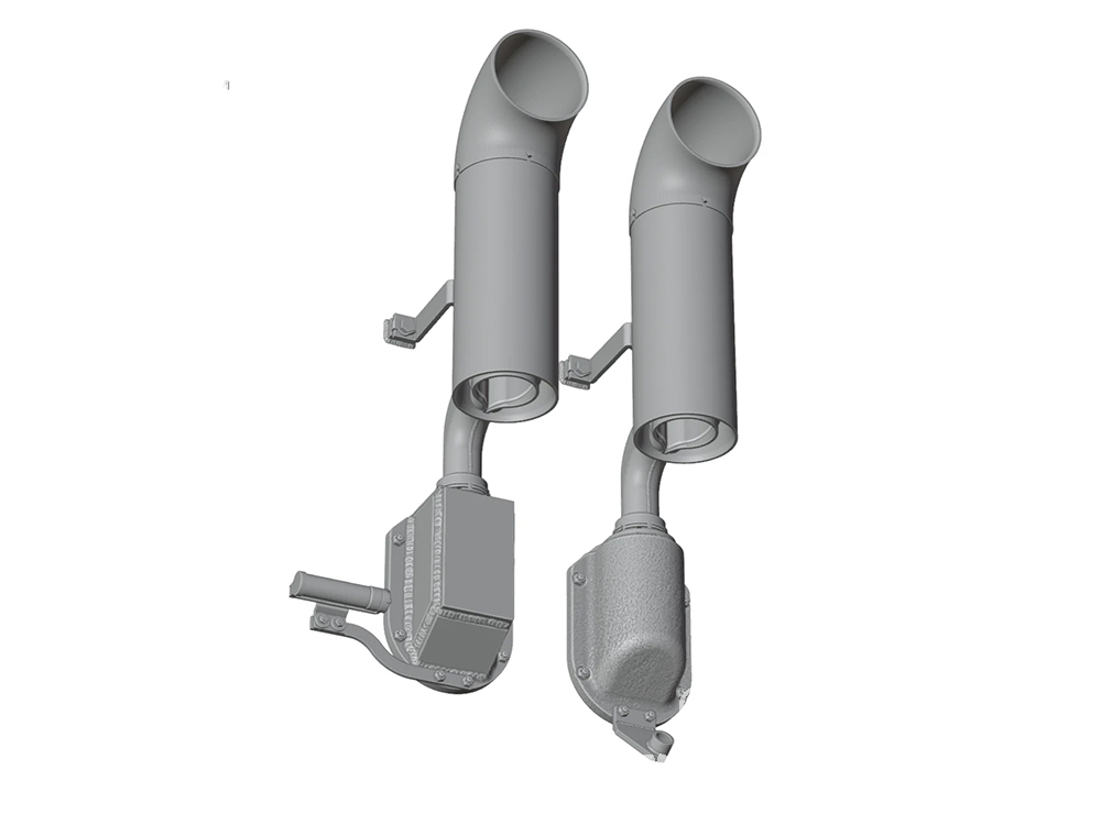 Ensemble d’échappements Flammenvernichter de haute qualité pour Panther G/F, Jagdpanther G2 et autres véhicules. Le set comprend deux tubes capotés ainsi que 4 supports blindés au choix : 2 de type moulé et 2 de type soudé.