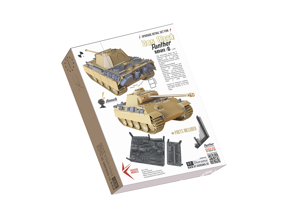 Conçu pour remplacer les détails manquants ou simplifiés du Panther G DasWerk, ce kit est également compatible avec tous les kits de Panther Ausf. G modernes des principaux fabricants.