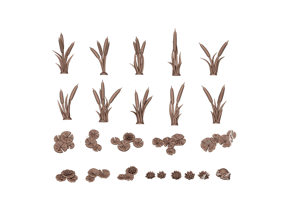 Roseaux et nénuphars, parfaits pour accompagner des armées miniatures d'inspiration orientale comme Cathay, ou simplement pour ajouter une touche asiatique à vos dioramas et figurines.