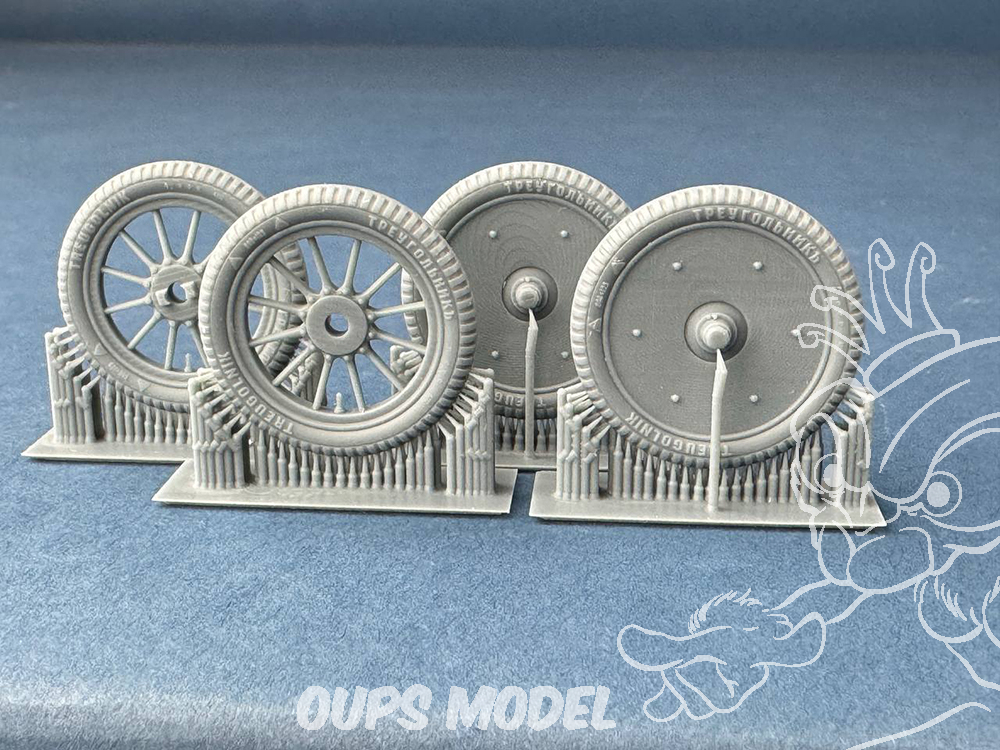 Un ensemble de quatre roues arrière imprimées en 3D, reproduisant la version avec les imposants disques blindés extérieurs visibles sur plusieurs photographies d'époque.