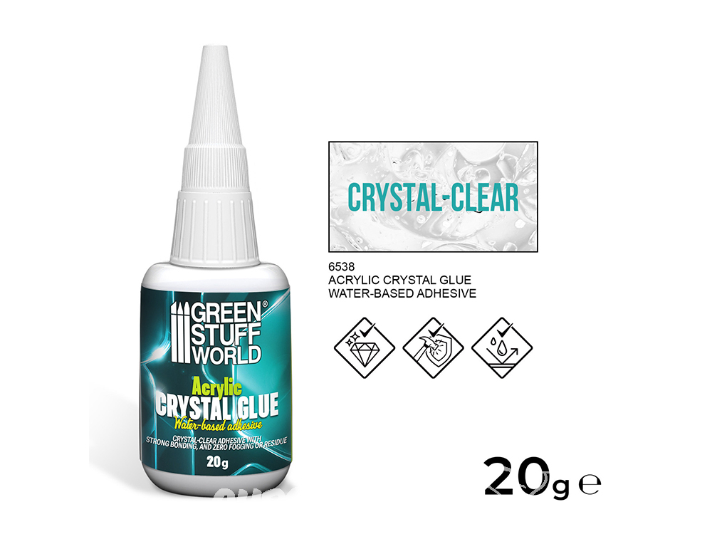 La Acrylic Crystal Glue de Green Stuff World est une colle acrylique transparente spécialement formulée pour les pièces transparentes et les matériaux délicats. Elle offre une forte adhérence sans voile blanc (fogging) ni résidus, ce qui en fait le choix parfait pour les cockpits d’avions, socles pour figurines transparents pour figurines, vitrines et autres composants clairs. Contrairement aux colles cyanoacrylates, elle ne dégage pas de vapeurs responsables de l’effet blanchâtre ou « blooming », garantissant des assemblages propres et nets en toutes circonstances.