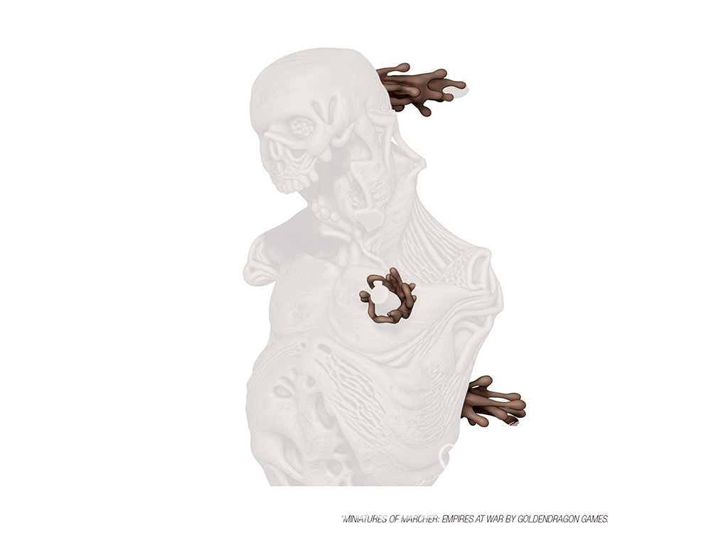 Effets de sang imprimés en 3D. Le liquide, projeté en formes turbulentes évoquant le drame et la violence des batailles les plus sanglantes, est sculpté avec une précision méticuleuse, capturant les éclaboussures et les flots de sang qui semblent encore palpiter de la force vitale des victimes.