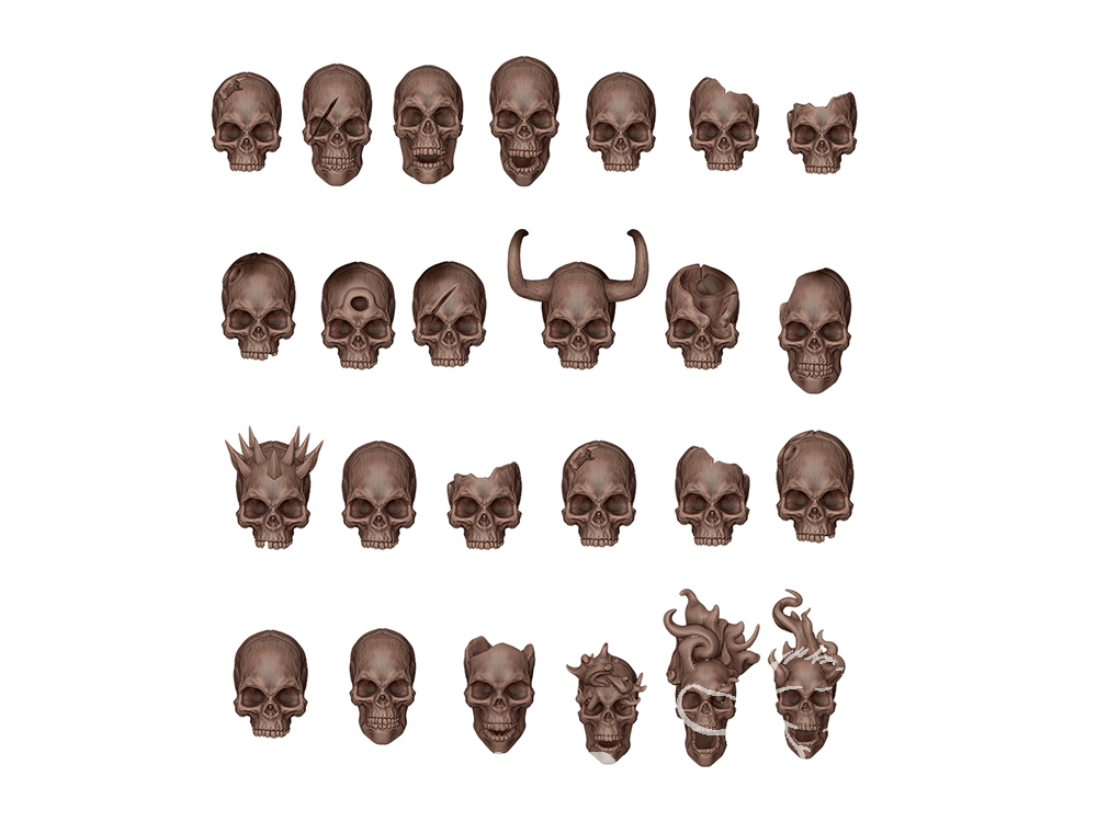 Crânes en résine imprimés en 3D, petits et très détaillés, parfaits pour ajouter une touche sombre et sinistre aux socles de vos figurines, dioramas ou scènes. Idéaux pour créer des scènes de bataille, des cimetières ou des lieux maudits, ils ajoutent réalisme et intensité dramatique à vos parties.