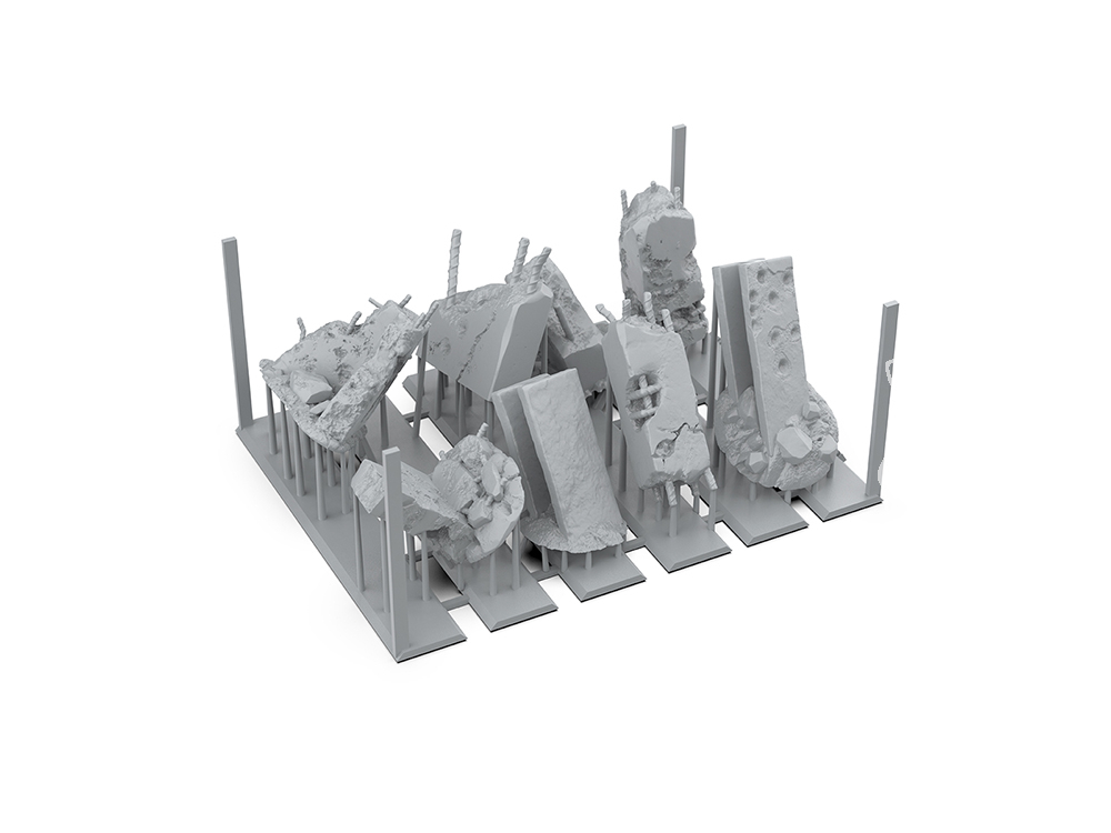 Cet élément simule les ruines en béton d'un bâtiment détruit, idéal pour les jeux de plateau futuristes comme Warhammer 40,000 ou Infinity War.