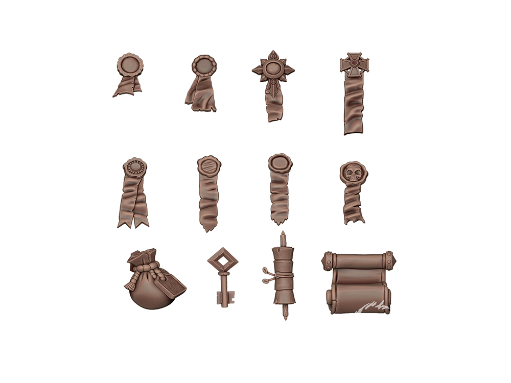 Ensemble de sceaux et de parchemins commémoratifs à accrocher à la ceinture ou au torse d'une figurine. Les sceaux sont idéaux pour Warhammer 40,000, tandis que les parchemins sont très polyvalents et peuvent être utilisés sur des figurines de différents jeux ou placés sur des socles et des décors pour ajouter une touche d'atmosphère.