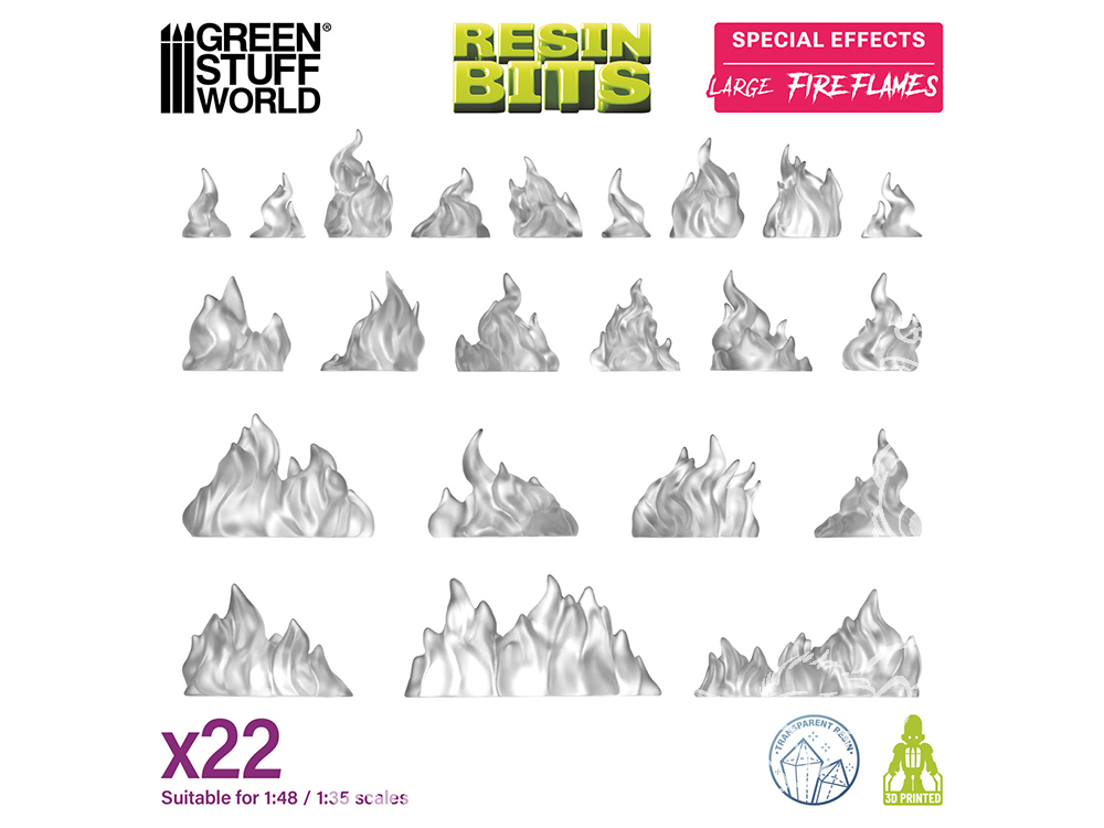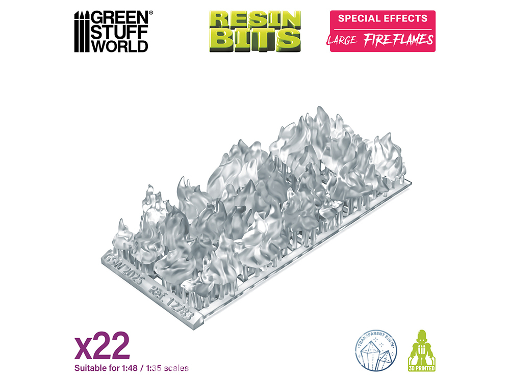 Découvrez nos sets Flammes de feu, un ensemble d'effets imprimés en 3D avec de la résine transparente ABS-like, conçus pour ajouter du réalisme, du dynamisme et de l'énergie à vos dioramas, décors et miniatures. Ces pièces reproduisent avec précision des flammes et des langues de feu de petite taille, parfaites pour représenter des torches, des bougies, des feux de camp ou des restes d'incendies, ainsi que pour être combinées avec d'autres effets de bataille.