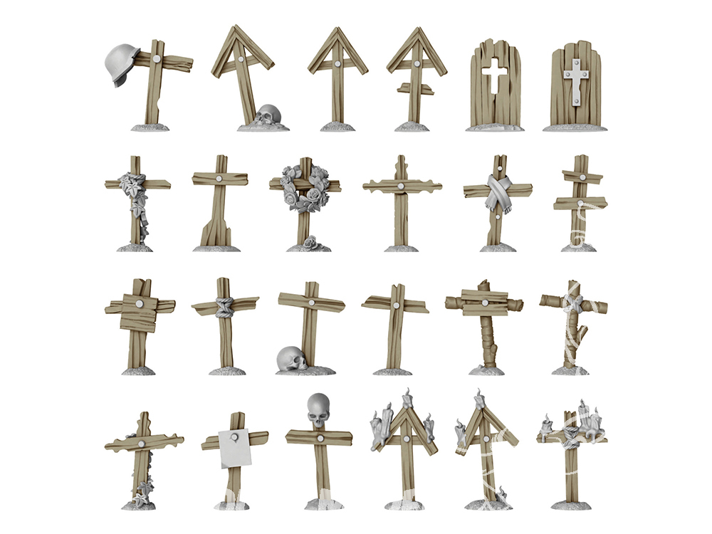 Parfaites pour des miniatures de 32 à 54 mm (échelles 1:48 à 1:35), ces croix et pierres tombales peuvent servir de marqueurs funéraires, de symboles religieux ou simplement d’éléments décoratifs pour des zones oubliées. Produit livré non peint.