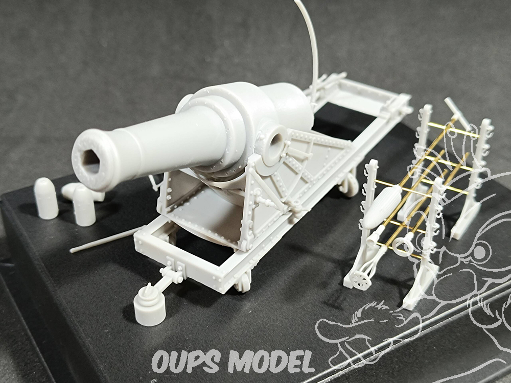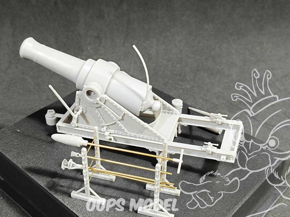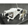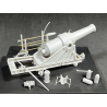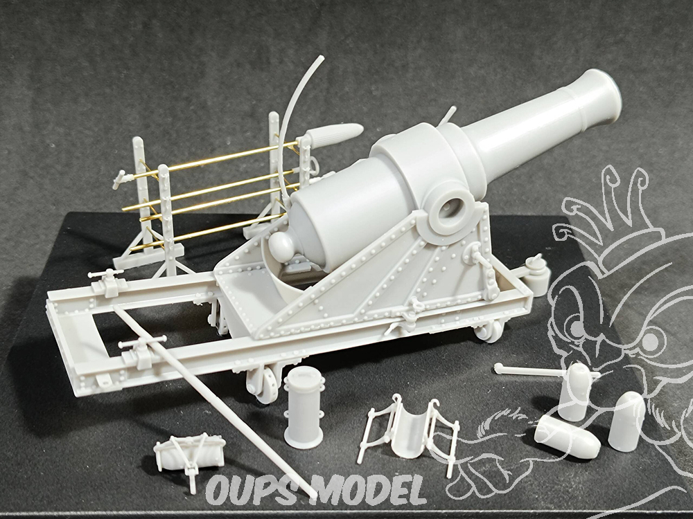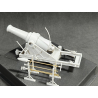 Obusier en fer nervuré et cerclé de 21 cm, accompagné de kits d'armes et d'accessoires imprimés en résine 3D. Comprend des tiges métalliques pour l'utilisation avec des outils à main et des tréteaux.