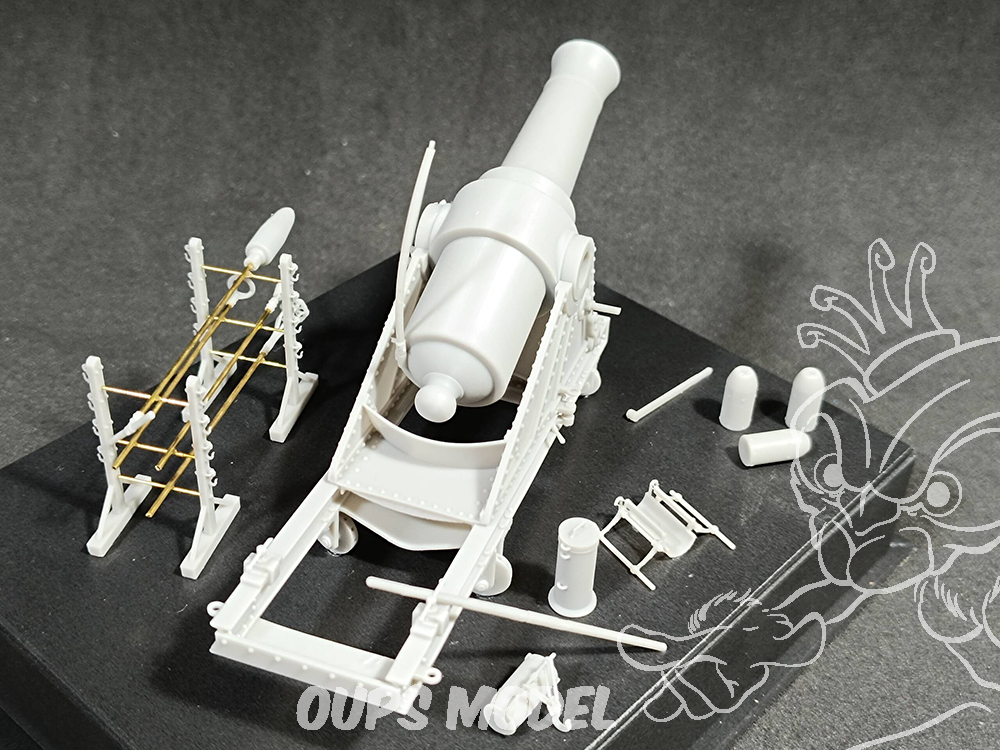 Obusier en fer nervuré et cerclé de 21 cm, accompagné de kits d'armes et d'accessoires imprimés en résine 3D. Comprend des tiges métalliques pour l'utilisation avec des outils à main et des tréteaux.