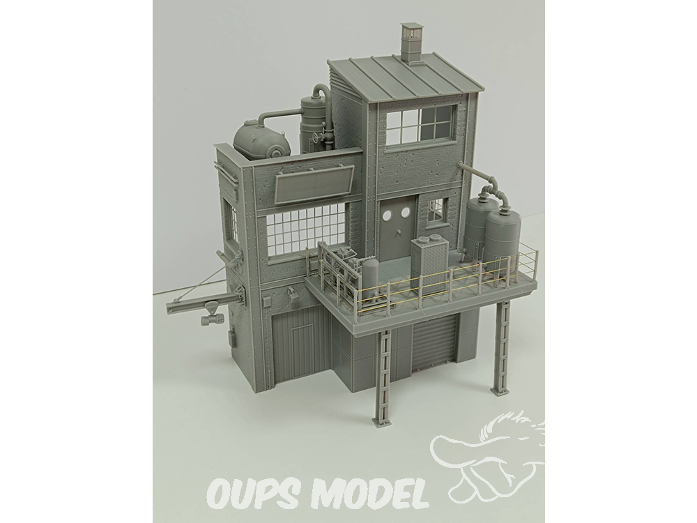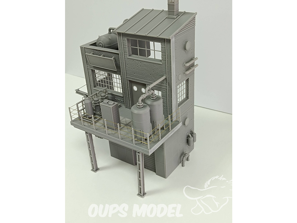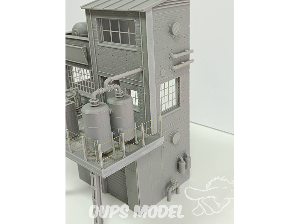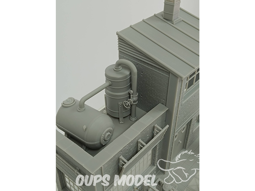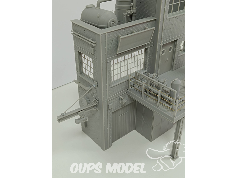 Ce kit de 91 pièces représente une section d'usine à l'échelle 1:35. Conçue et imprimée en 3D en résine de haute qualité, cette scène convient à différentes périodes historiques. Mesurant 30 cm x 18 cm x 34 cm de hauteur, elle regorge de détails et de textures. Les pièces métalliques ne sont pas incluses.