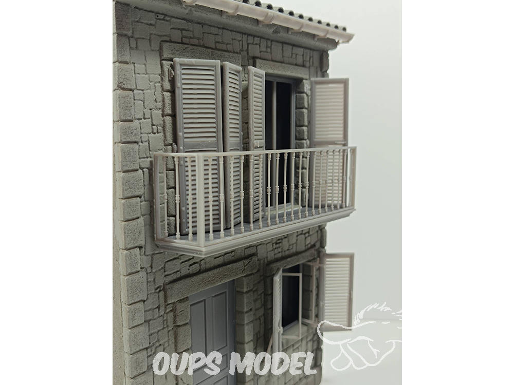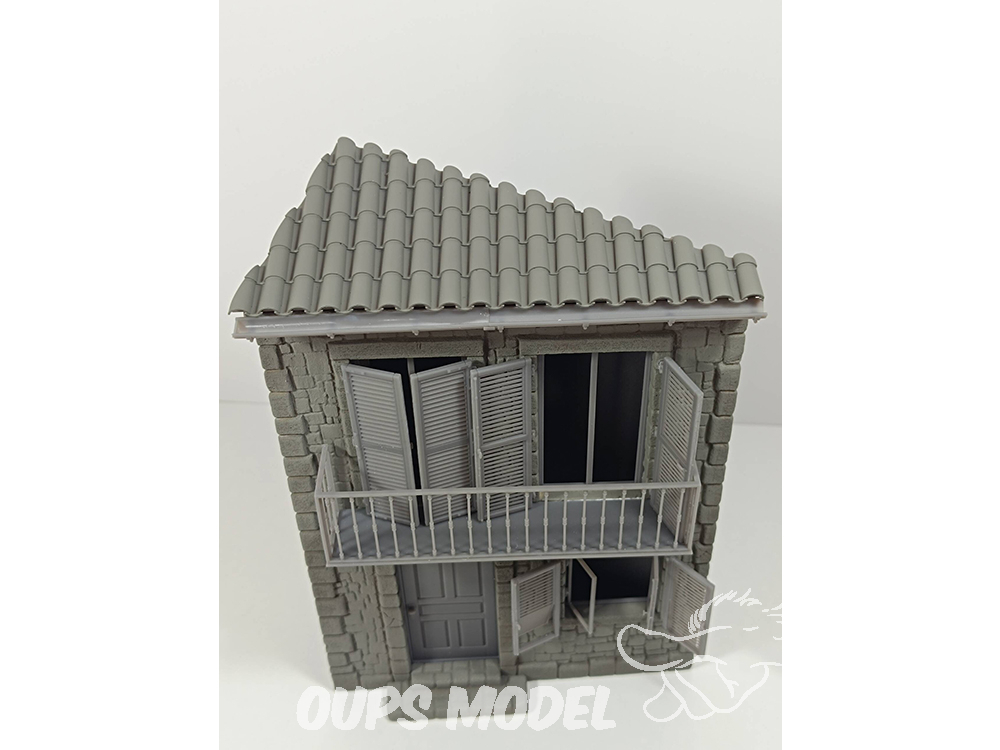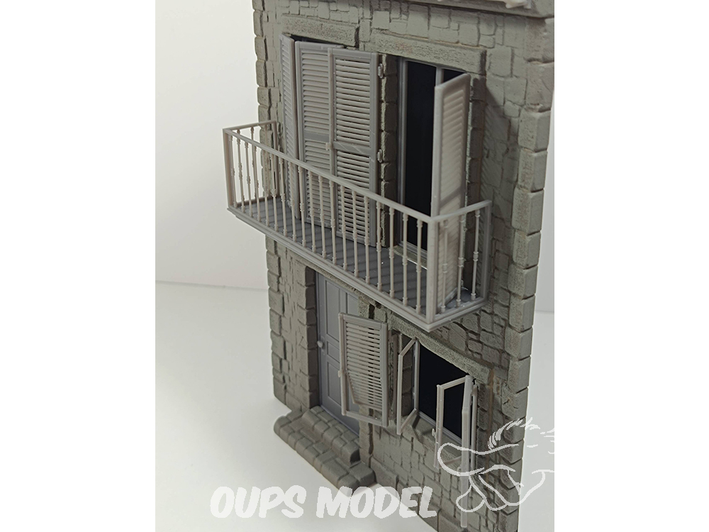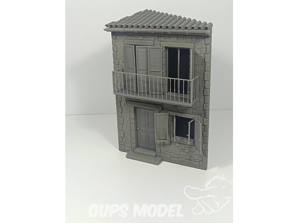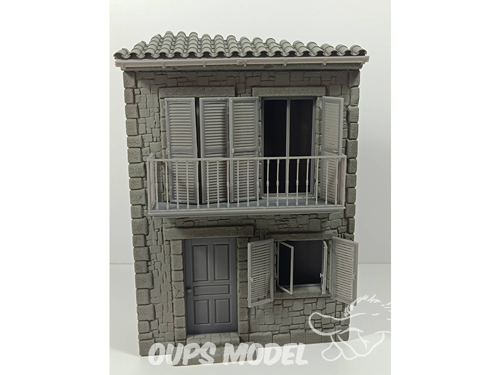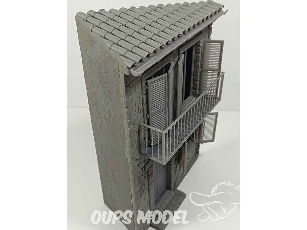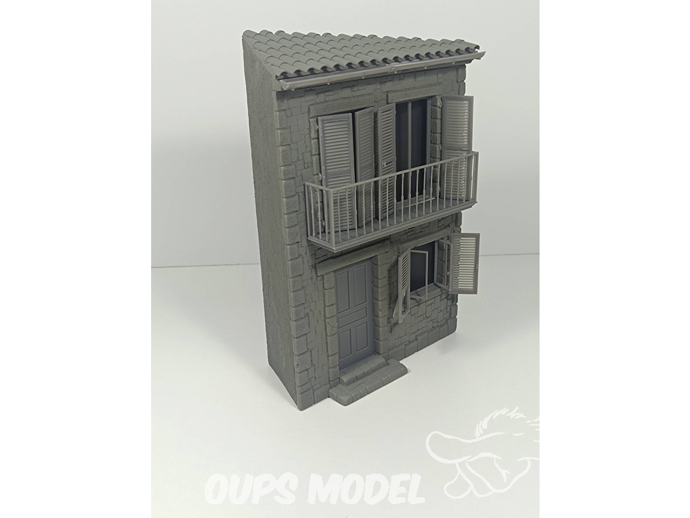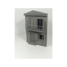 Maison d'angle à deux étages, à l'échelle 1:35, en résine avec détails imprimés en 3D.