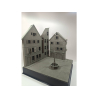Composition : L'ensemble comprend trois bâtiments détaillés, un pavage réaliste et une fontaine centrale qui attire le regard.