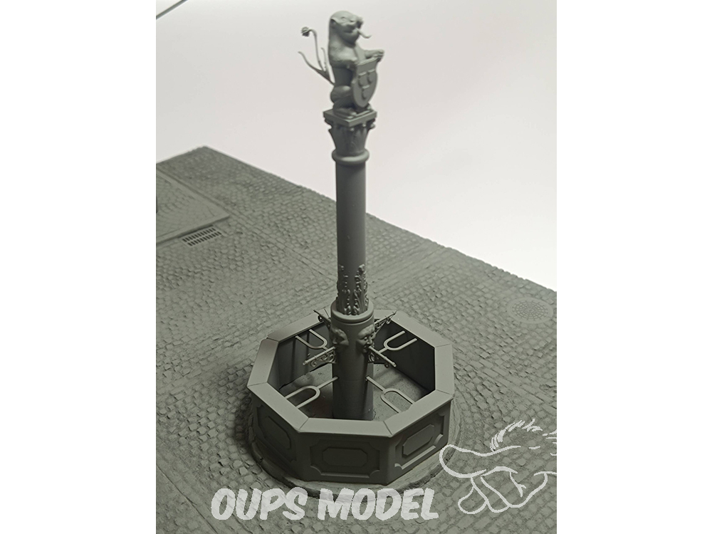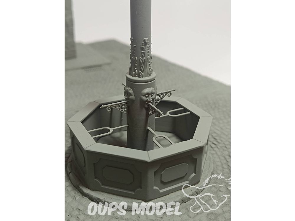 Éléments de détail (fontaine, accessoires) : Des techniques d’impression 3D de précision ont été utilisées pour créer divers éléments, permettant une géométrie complexe et un réalisme inégalé dans de petites pièces telles que la fontaine et d’autres accessoires de la place.