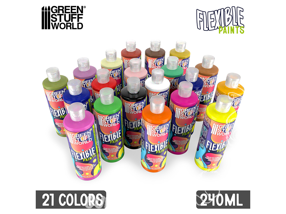 Les peintures flexibles sont conçues pour maintenir l'adhérence et la durabilité même lorsque la surface sur laquelle elles sont appliquées se plie ou bouge. Contrairement aux peintures standard qui peuvent se fissurer ou s'écailler lorsqu'elles sont pliées, ces peintures souples contiennent des additifs spéciaux qui améliorent leur flexibilité. La formule de Green Stuff World ne contient ni latex ni vinyle pour éviter les réactions allergiques et est idéale pour une utilisation sur des matériaux tels que le mousse EVA, le latex, le tissu, le cuir, les impressions 3D et divers matériaux de cosplay.