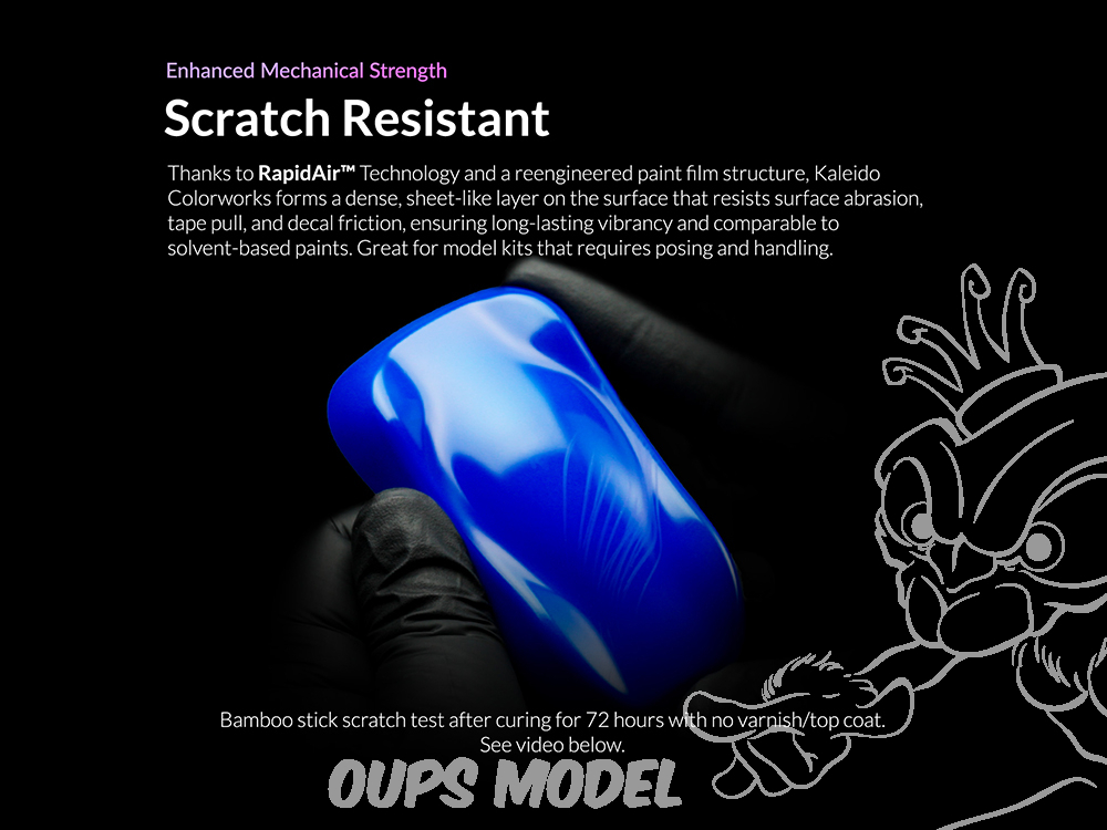 La gamme RapidAir™ de Kaleido Colorworks est une peinture acrylique haut de gamme, conçue pour une application à l'aérographe lisse et performante. Sa formule écologique, non toxique et sans solvant est pré-diluée en usine pour une utilisation directe ou une dilution facile. Grâce à la technologie RapidAir™ , elle résout les problèmes courants des peintures à l'eau, tels que les coulures, la couverture irrégulière et les bavures, en s'appliquant en une couche lisse et uniforme. Cette formule avancée offre une forte adhérence, une résistance aux rayures, une durabilité et un fini brillant comparable aux peintures à base de solvant. Sans apprêt, elle adhère à l'ABS, au PE, au PC, à la résine, au verre, au tissu, au métal et bien plus encore. Idéale pour le modélisme, les loisirs créatifs, le bricolage et un usage professionnel.