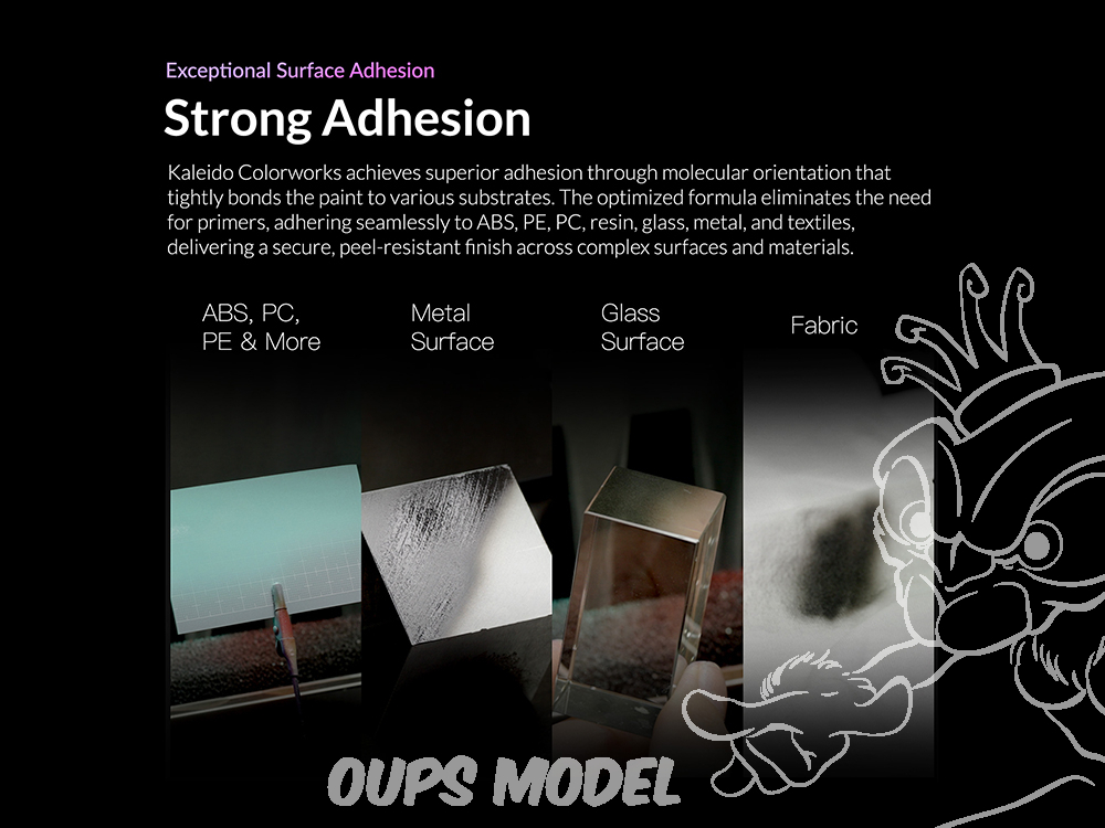 Forte adhérence : Notre peinture adhère à la plupart des surfaces, notamment l'ABS, le PC, le PE, la résine, le métal, le verre, le tissu, le bois et bien d'autres. Aucune sous-couche n'est nécessaire.