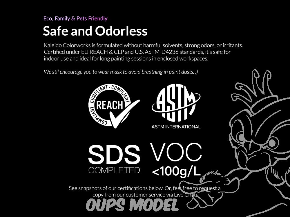 Sûr et inodore : Certifié sûr et écologique, sans solvants nocifs ni odeurs. Entièrement conforme aux normes de sécurité européennes et américaines, idéal pour une utilisation en intérieur.